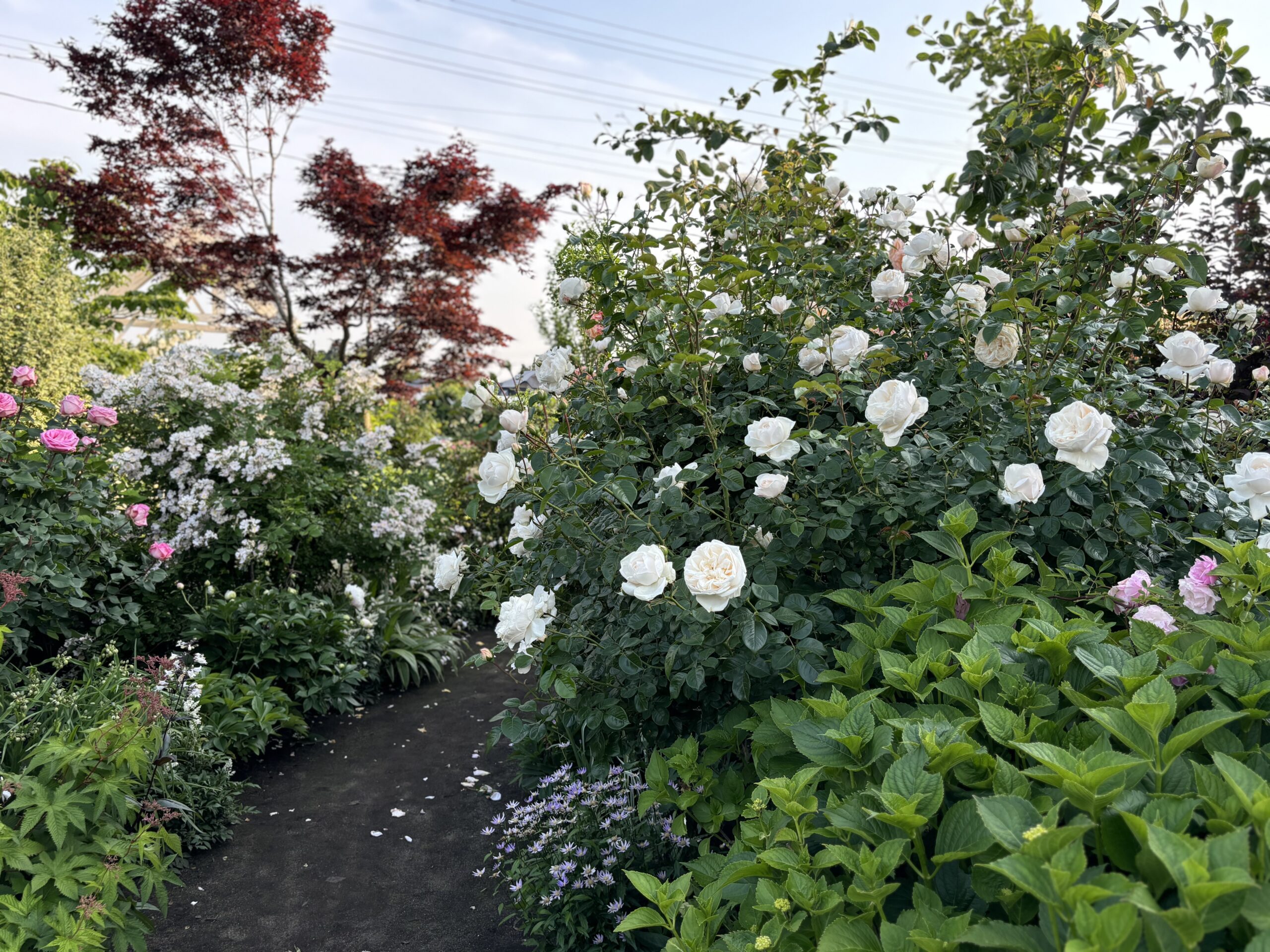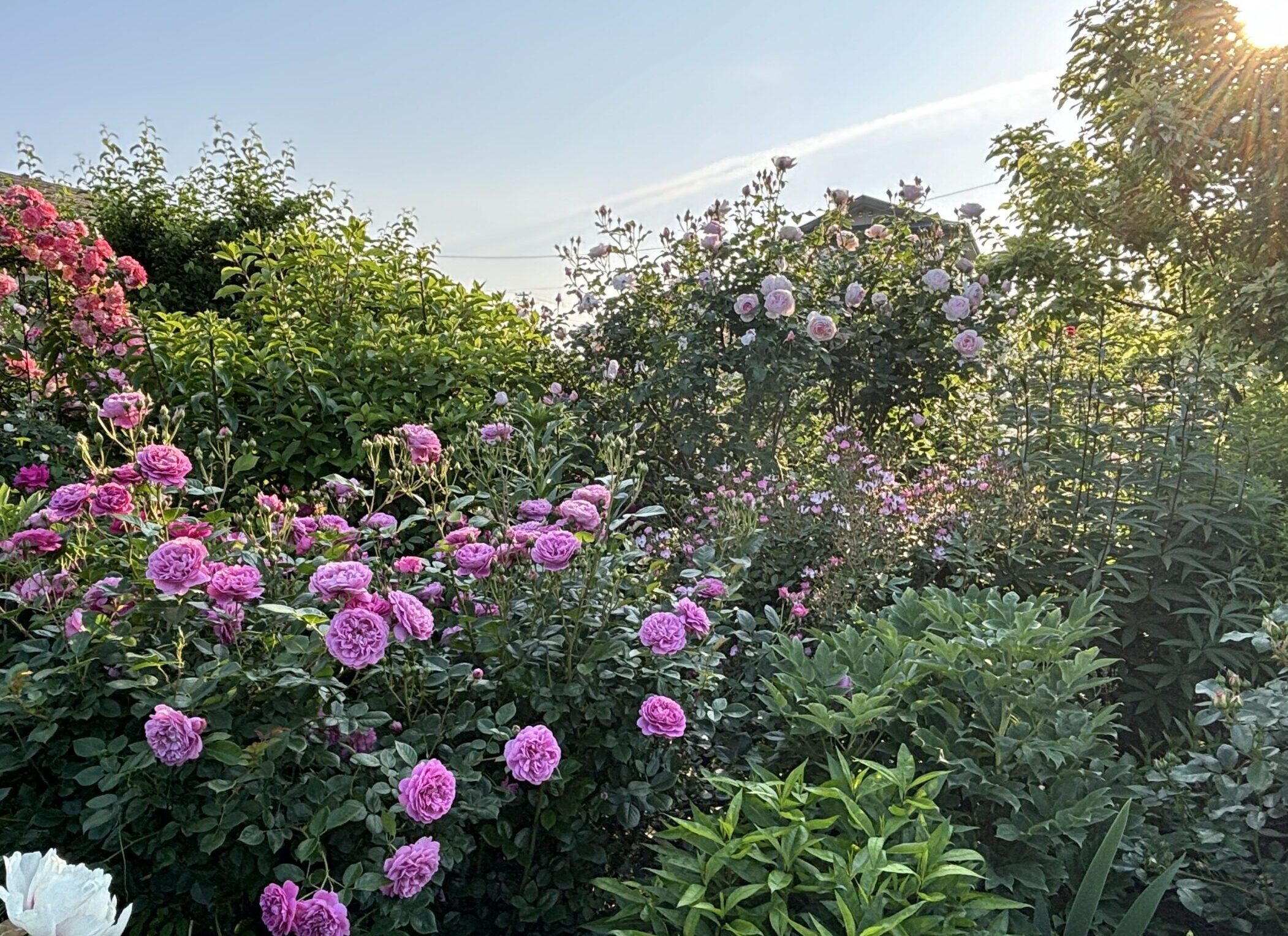 ・・・・ってそう考えると、うちが言ってる『自然樹形』とは『剪定樹形』なのかもしれませんが、でもそう言っちゃうと今度は何だか、バラを刈り込んで型に嵌めちゃってるイメージになりそうですし・・・・兎も角、百聞一見に如かずということで⇩  エリアによって粗密ありますが大体こんな感じで200品種以上のガーデンローズ(株数だと300くらい?よく訊かれるんだけどカウントしてないから解らん)を育てています。