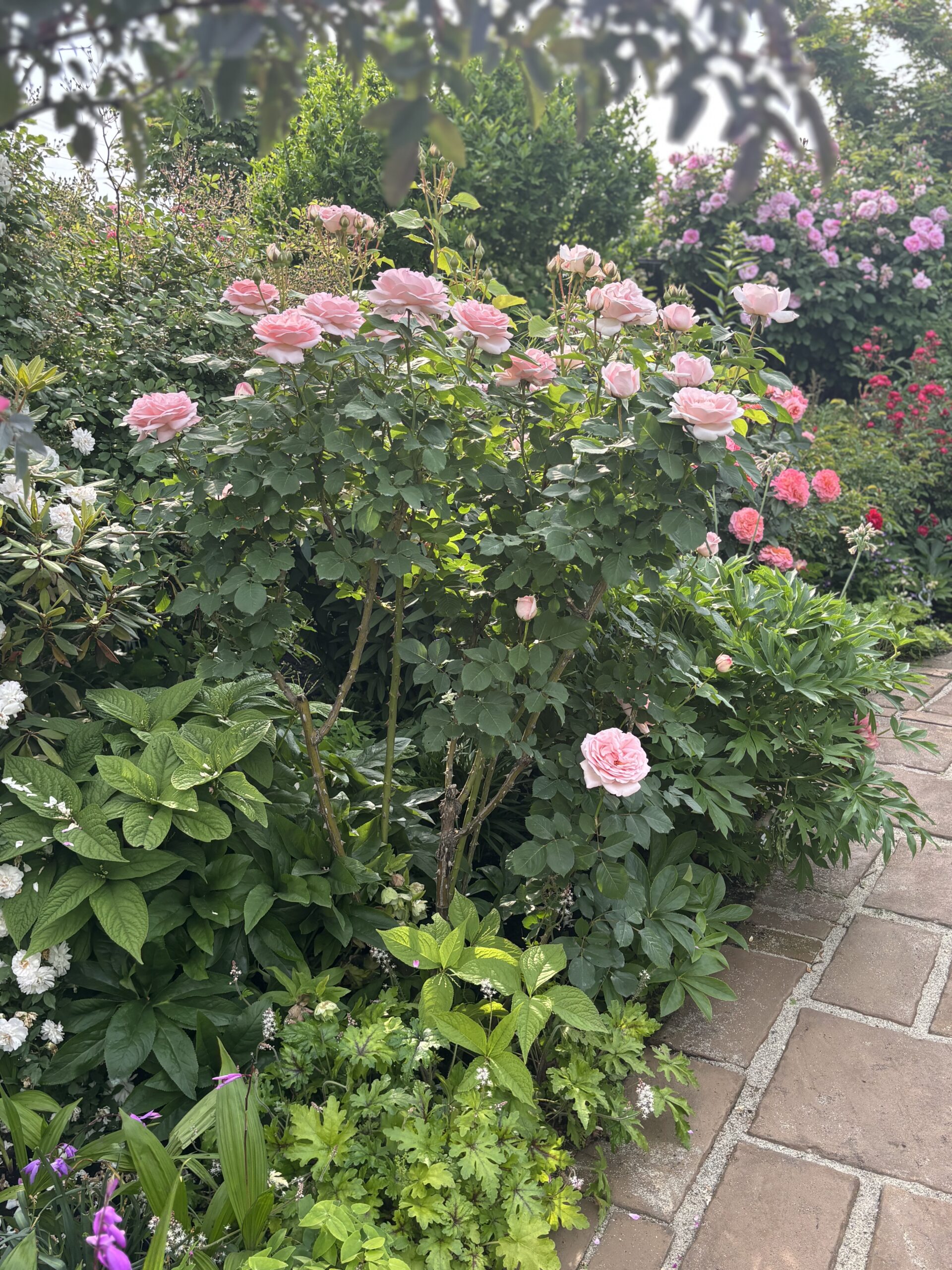 うぅ~~~ん!惜しい! 花付きがいい品種だから開花期は全体的にふんわりシュラブっぽくみえてるんだけど、実は株元の主幹は2~3本しかないつまり株の本体は今見えてる感じよりずっと小さいってコト。実際このあと花枝を切り戻すと、樹のサイズ感は今の半分以下になるでしょう。