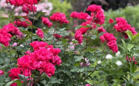 クリムゾン シャワー Crimson Shower 作出:1951年/イギリス 樹形:匍匐性つる 花期:極端な遅咲・一季 花径:小輪 交配:エクセルサ(別名:レッドドロシーパーキンス)の実生 備考:うちには二株あるんです...