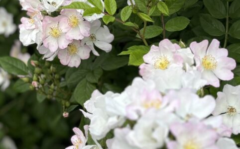 ロサ ムルティフローラ Rosa multiflora 作出:原種 樹形:大型・半横張性シュラブ 花期:中咲・一季 花径:小輪 備考:日本自生種で『ノイバラ』 国産苗の台木。 近代のバラに房咲性を与えた重要な品種。 山...