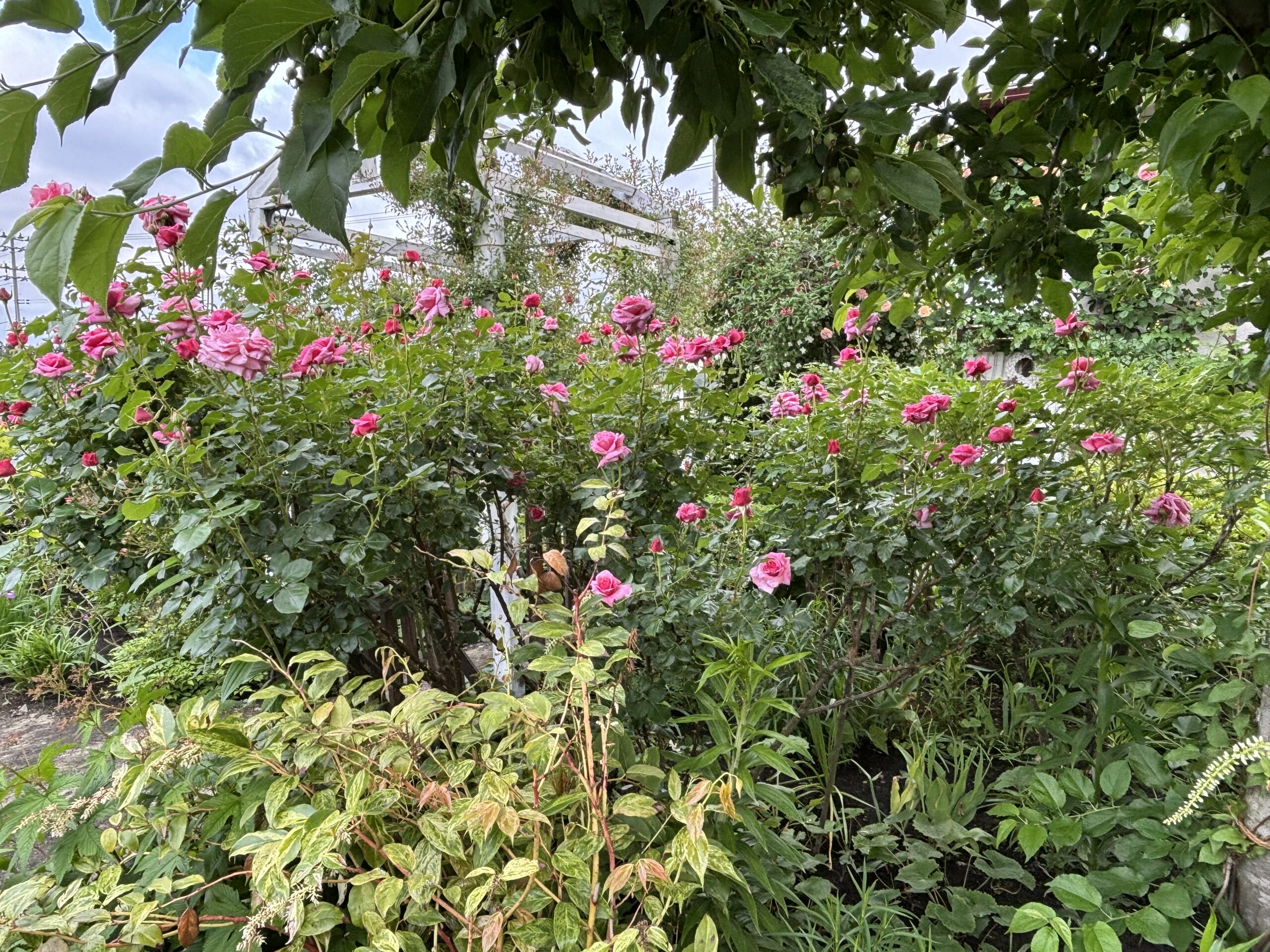 おまけになりますがピンクのバラがより映えるよう、木製アーチを白く塗ってみたりw 庭仕事っていうよりこうなると庭遊びですね。
