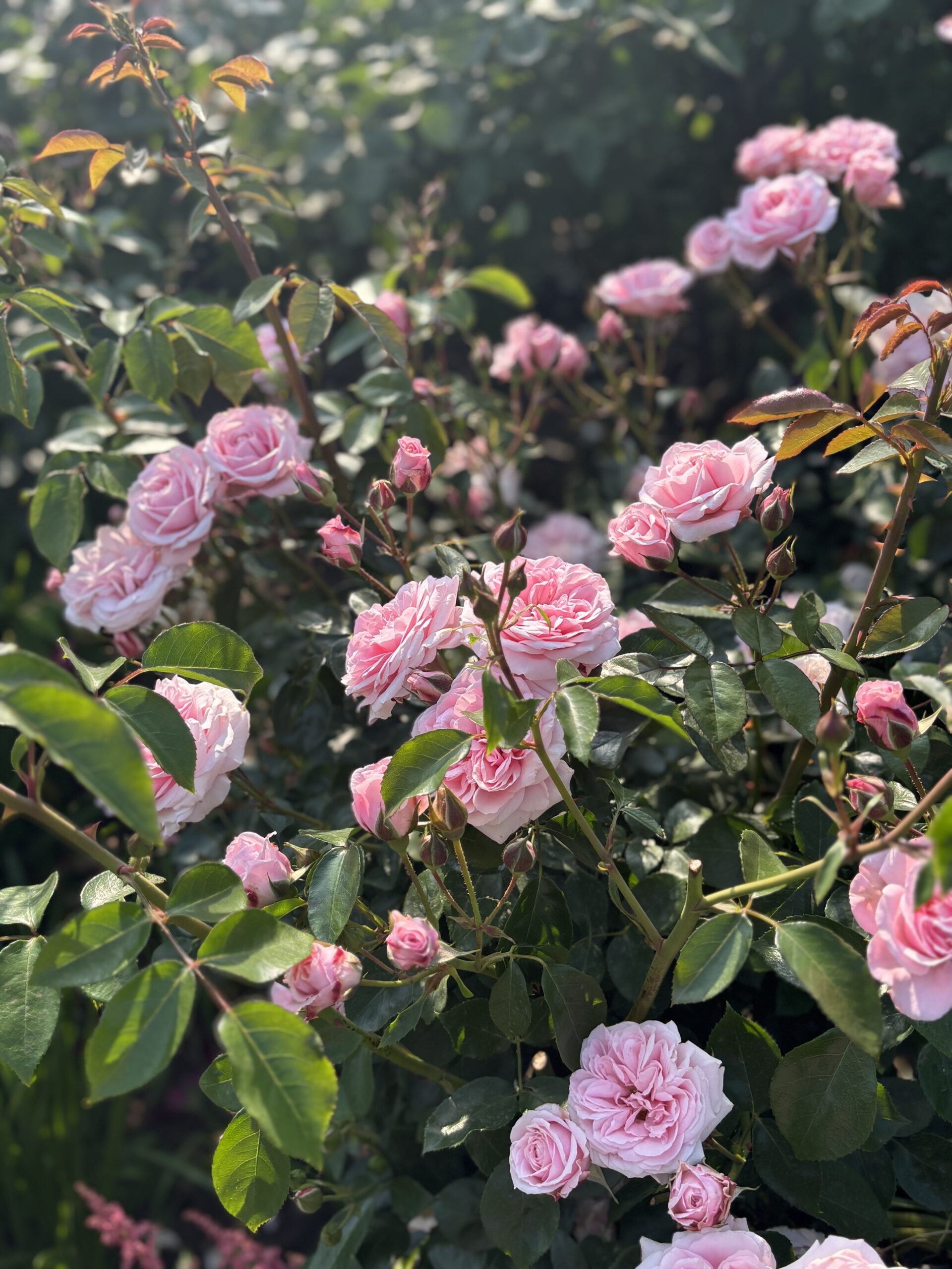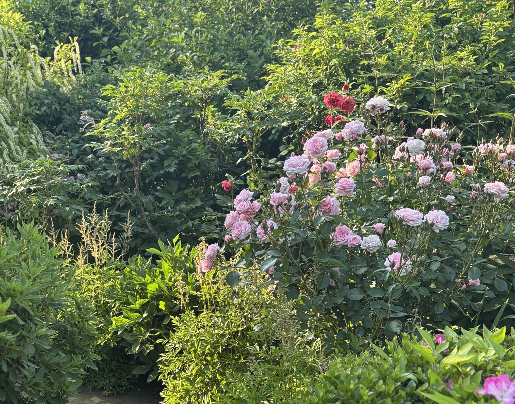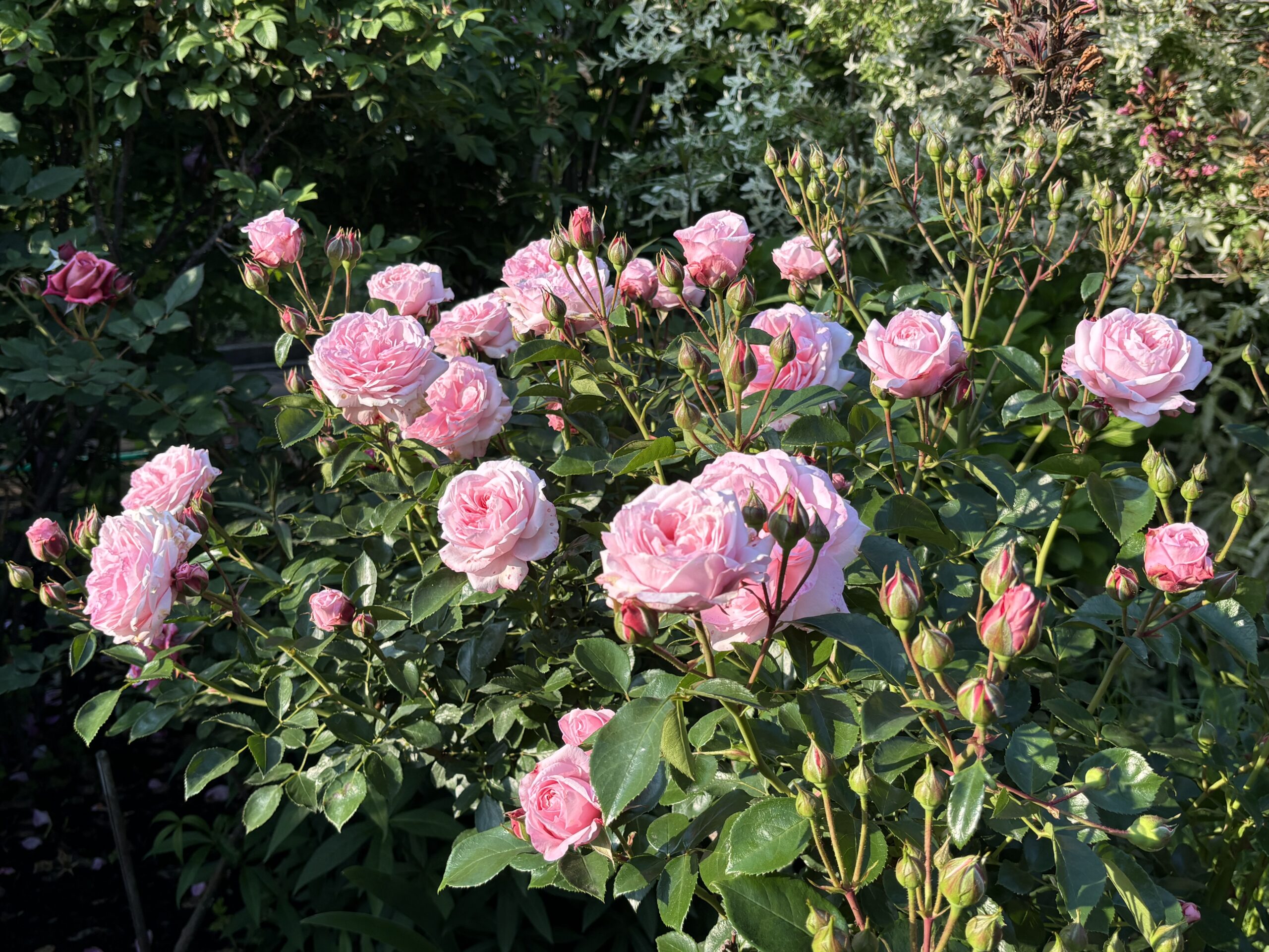 ⇧赤バラはディープボルドー。画面中央らへんのピンクはボニカ82それとサニーノックアウト。左上隅は安曇野。その隣にアロハの咲き残り。