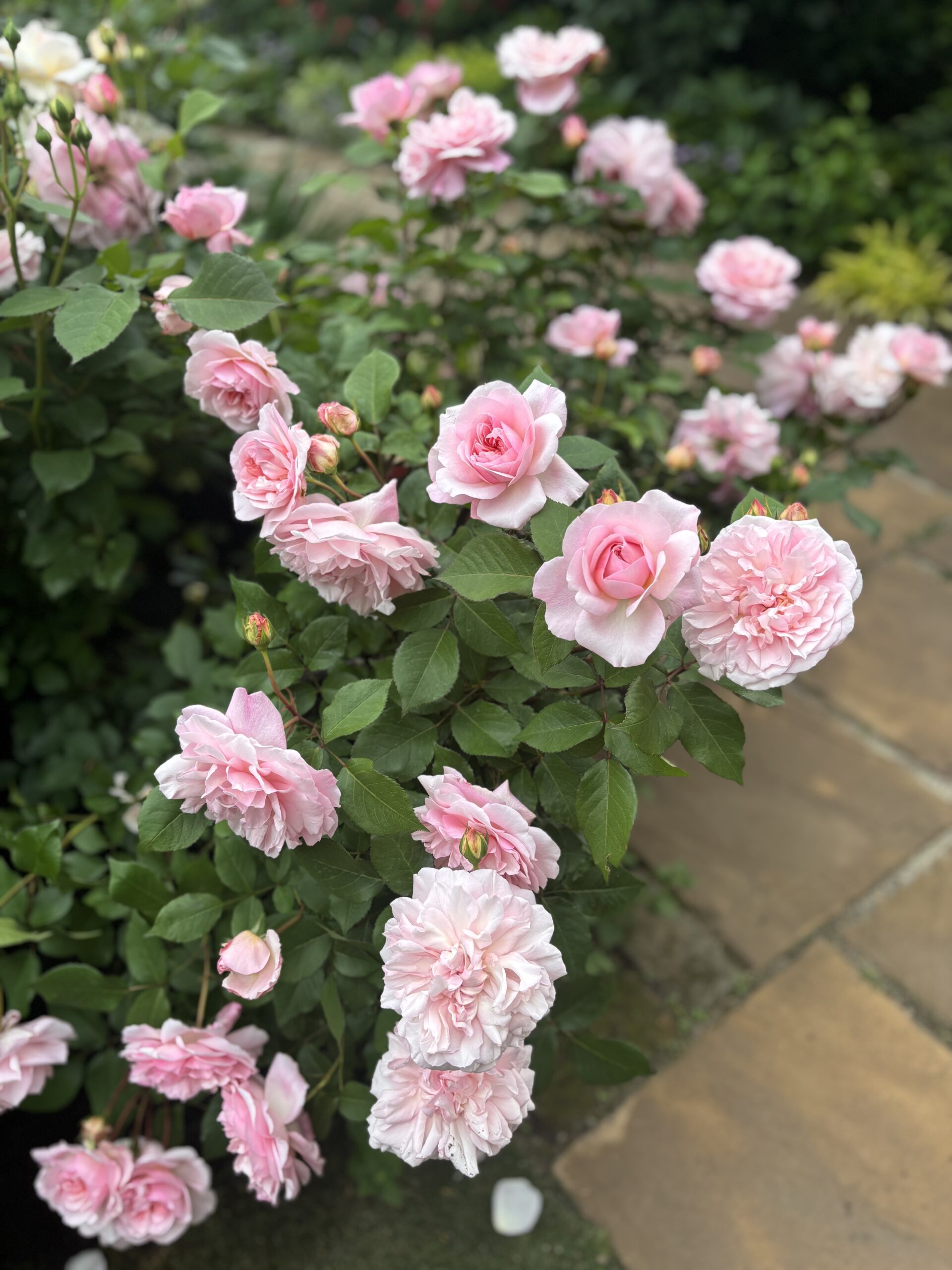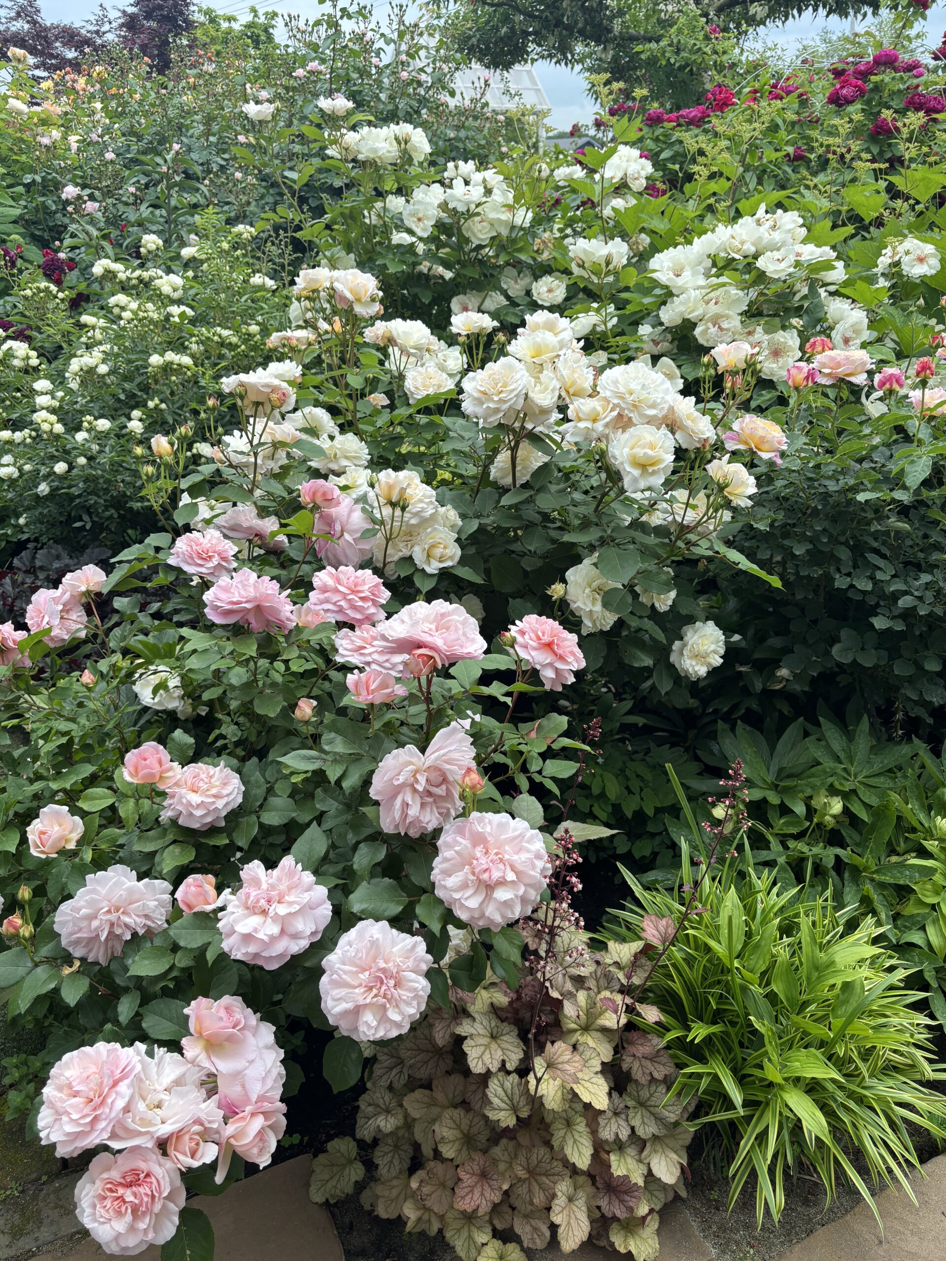 実は・・・・というものなんですが、実は当庭では元品種の色合いがかなり白っぽくなりがちだったんです。理由のひとつは開花時期の気候によるもの。そしてもうひとつは先述した古枝を多く残した剪定によるもの。なので仕方ないっちゃあ仕方ないんですけれども、けれども植栽デザイン担当者としての本音を言えば、この場所ではもうちょっとピンクが出てくれるバラのほうが・・・とかなんとか実は内心こっそり思ってたんですよね。とはいえ移植して違う品種のバラに入れ替えるか?と訊かれれば、それは嫌。絶対に嫌!色味云々はあるけど根本的にグラスアンアーヘン以上のバラなんて考えられない!って感じで、結構長らく胸中にモヤッと感を潜ませておりました。