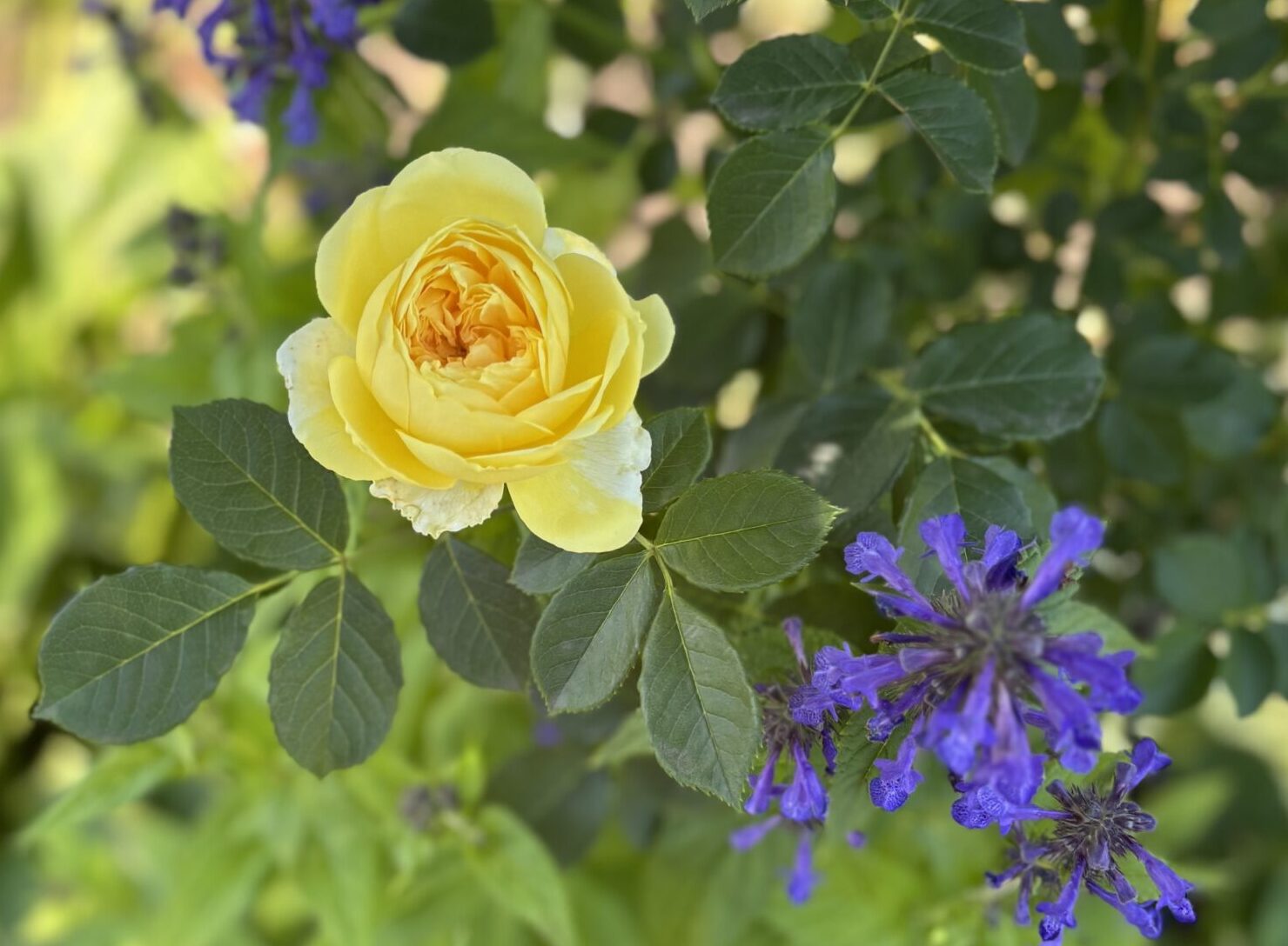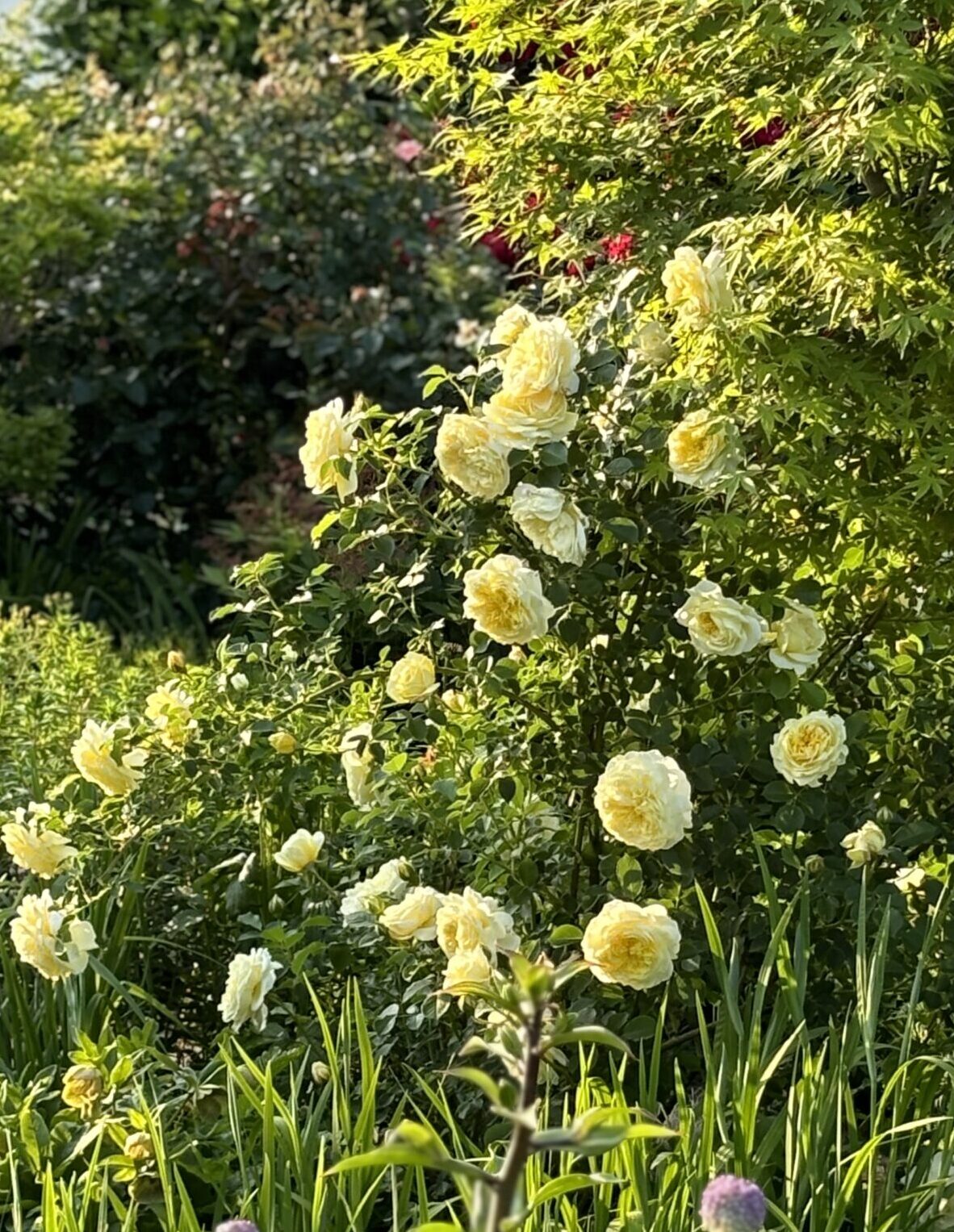 半つる状の枝が上空に向かってモシャモシャ茂るタイプのシュラブ。棘立ってはいますがしなやかさのある枝質で、程々自立出来るけど太枝性ではない。要するに・・・・いろいろ丁度いい塩梅のシュラブローズ。なのでうちでは青モミジの傍に植えて、なんとなーく自立シュラブ&なんとなーくつる誘引って感じに仕立ててます。