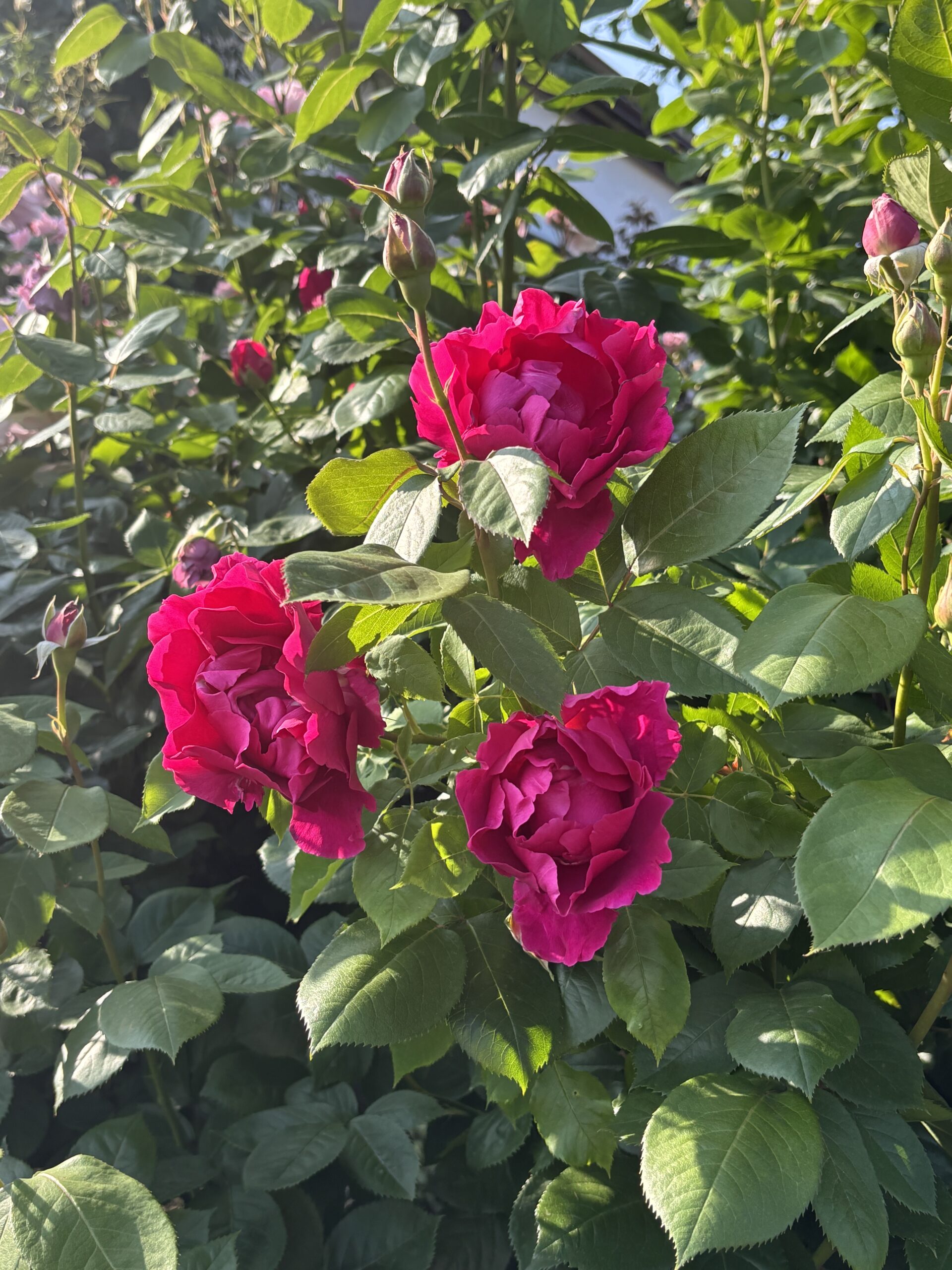 ショートクライマー程度の長めのシュートが時々出ます。固く無骨な枝ですが(難しい誘引はムリ)それを冬季に横倒しておくと花は並んで咲きます。但しコンスタントにそれが出来る訳ではないので基本的にはブッシュ。ひたすら御本人さま次第。さぁ、来シーズンはどうなる(笑)?