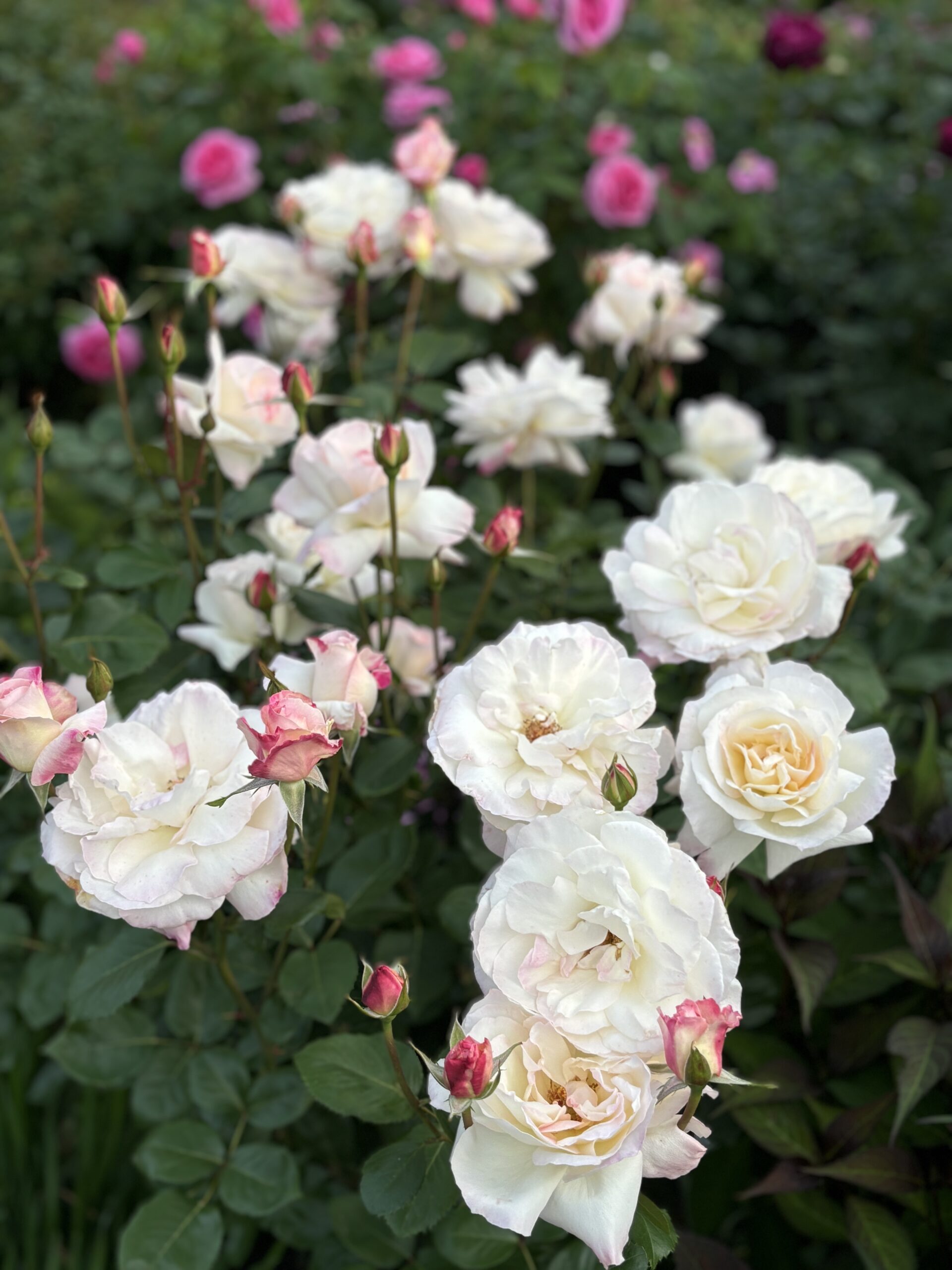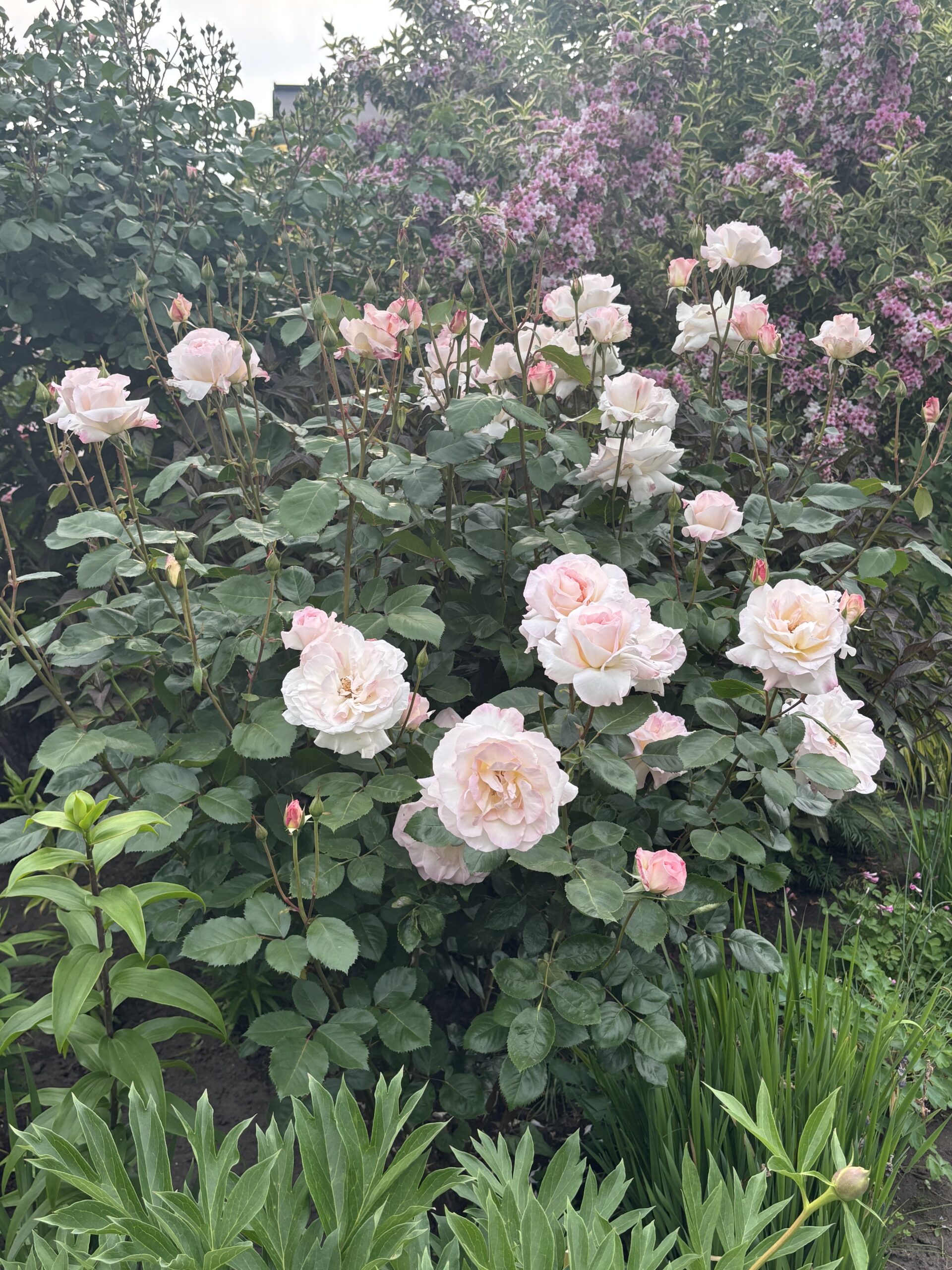 ⇧⇩お隣はガートルードジェキル 好対照な花容と樹姿。それでも株のサイズ感が同じなので意外とお似合い。お互いを引き立て合える相性かと。