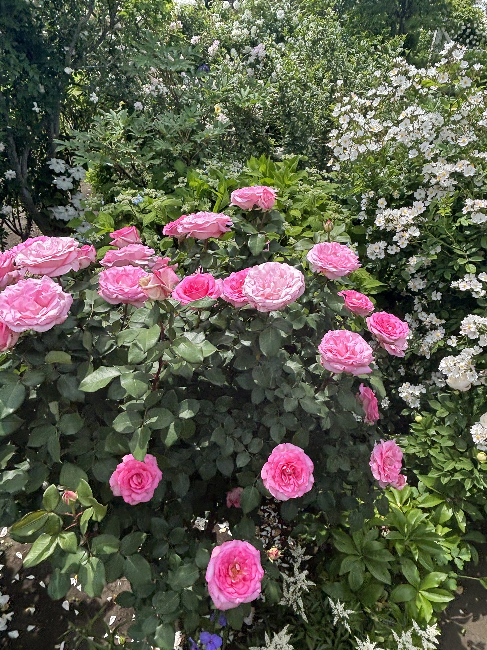 コルデス作出の品種には目のない私をして、実は完全にノーマークだったバラ。HTだし、顔写真もあまり好みじゃない気がして。ところが珍しく近隣のローズガーデンに見学にいった際(だって近隣でバラが咲く頃はうちも繁盛期で遊び歩いてる場合じゃない!)このバラの余りの逞しき立ち姿に思わず惚れ込み(そこかいっ!)足を止めて咲き残ってた一輪に眼を瞠り、そうして香りを嗅いで、うちにお迎えすることを固く心に誓ったという経緯。実物は写真よりずっとニュアンスのある花色。ベタ塗りのピンクじゃなく、特に蕾から咲き始めは、ピエールドロンサールやグレースケリーのような美しいグラデーションを魅せてくれます。