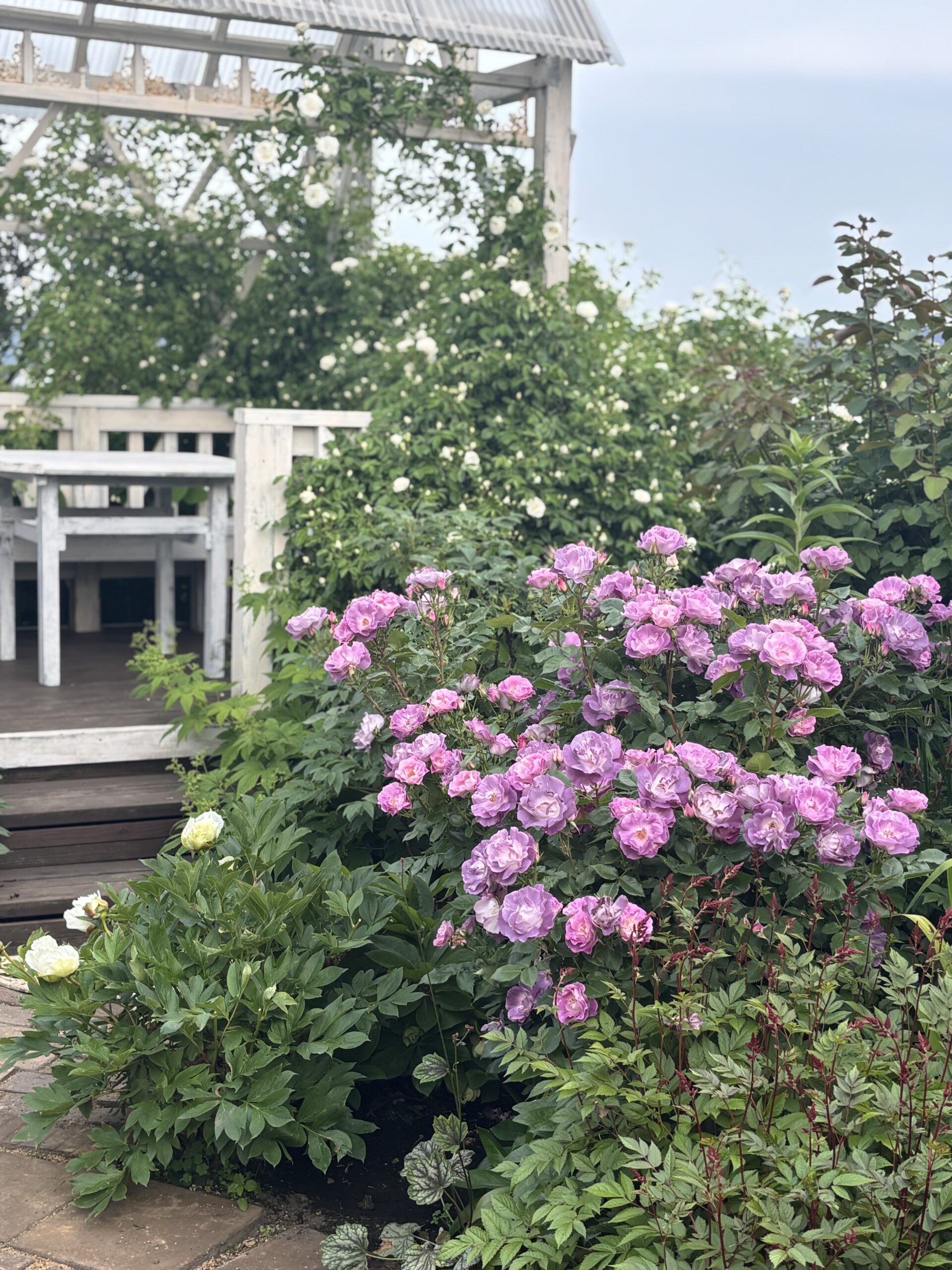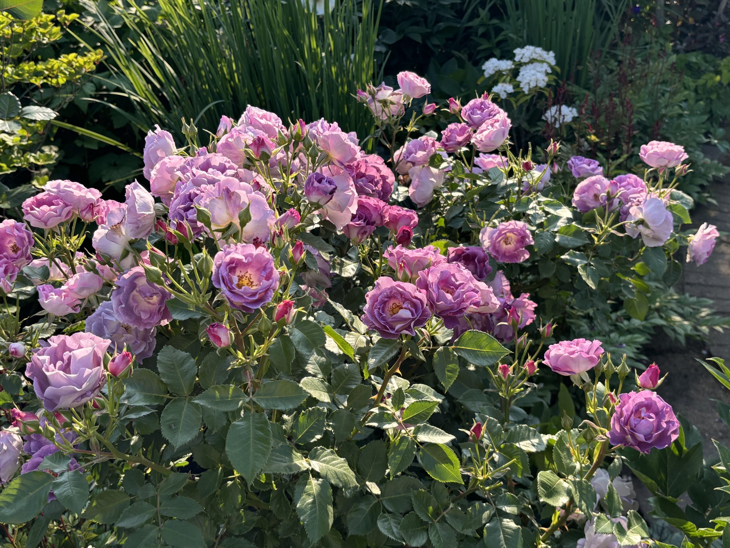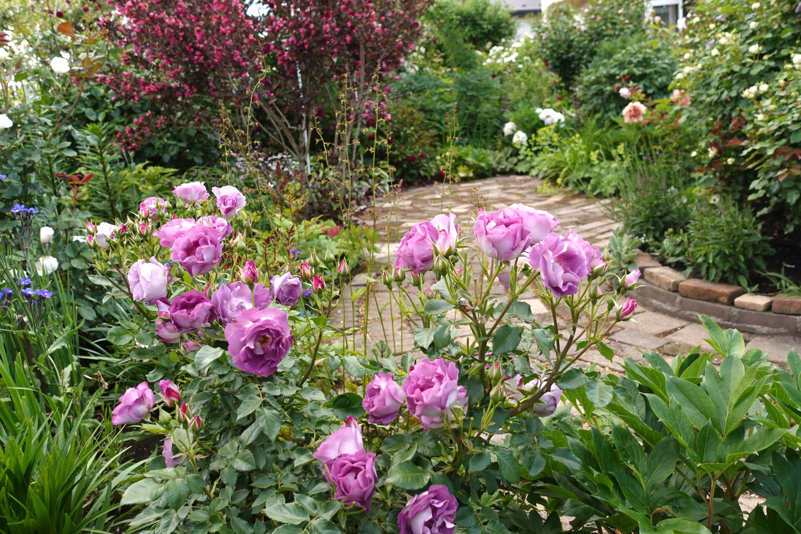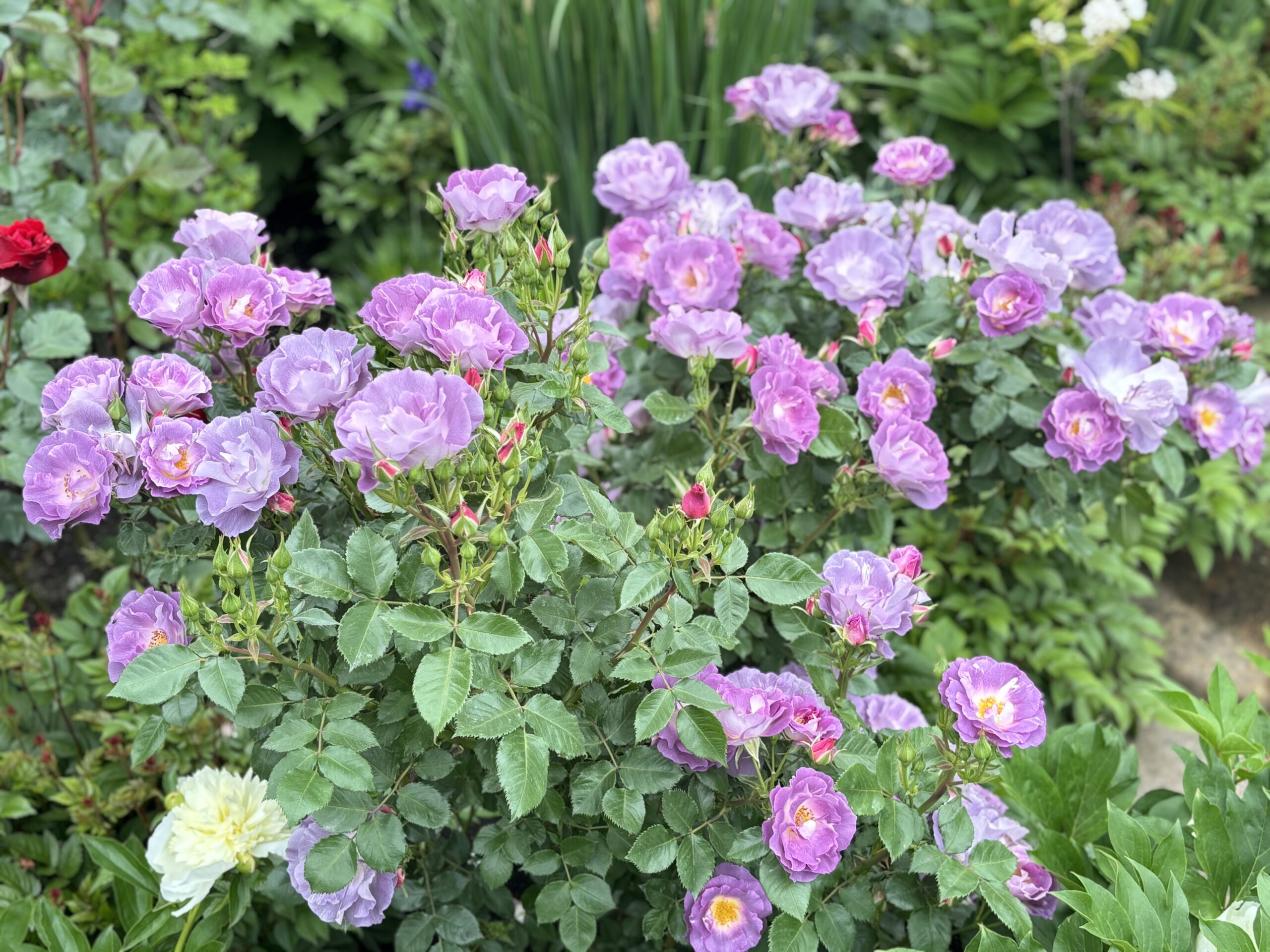 比較的早咲きなんですが、花数が多いのでその分花期が長いです。標準的な中咲バラの咲く前から咲き終わりまで。もしくは⇧アヤメや芍薬の頃に咲き始め、咲き終わるのは山アジサイの頃⇩ そこんところはラプソティと同じですね