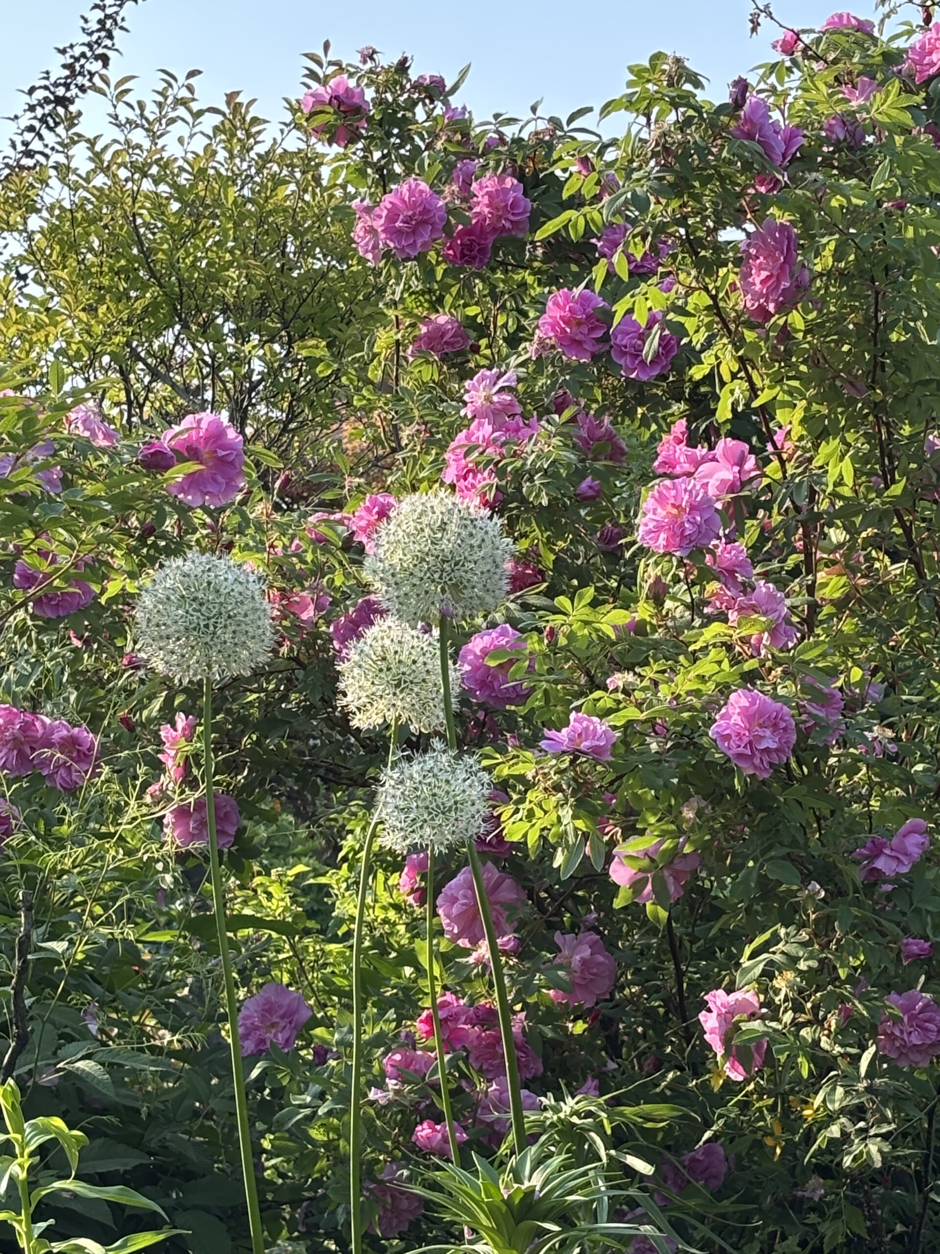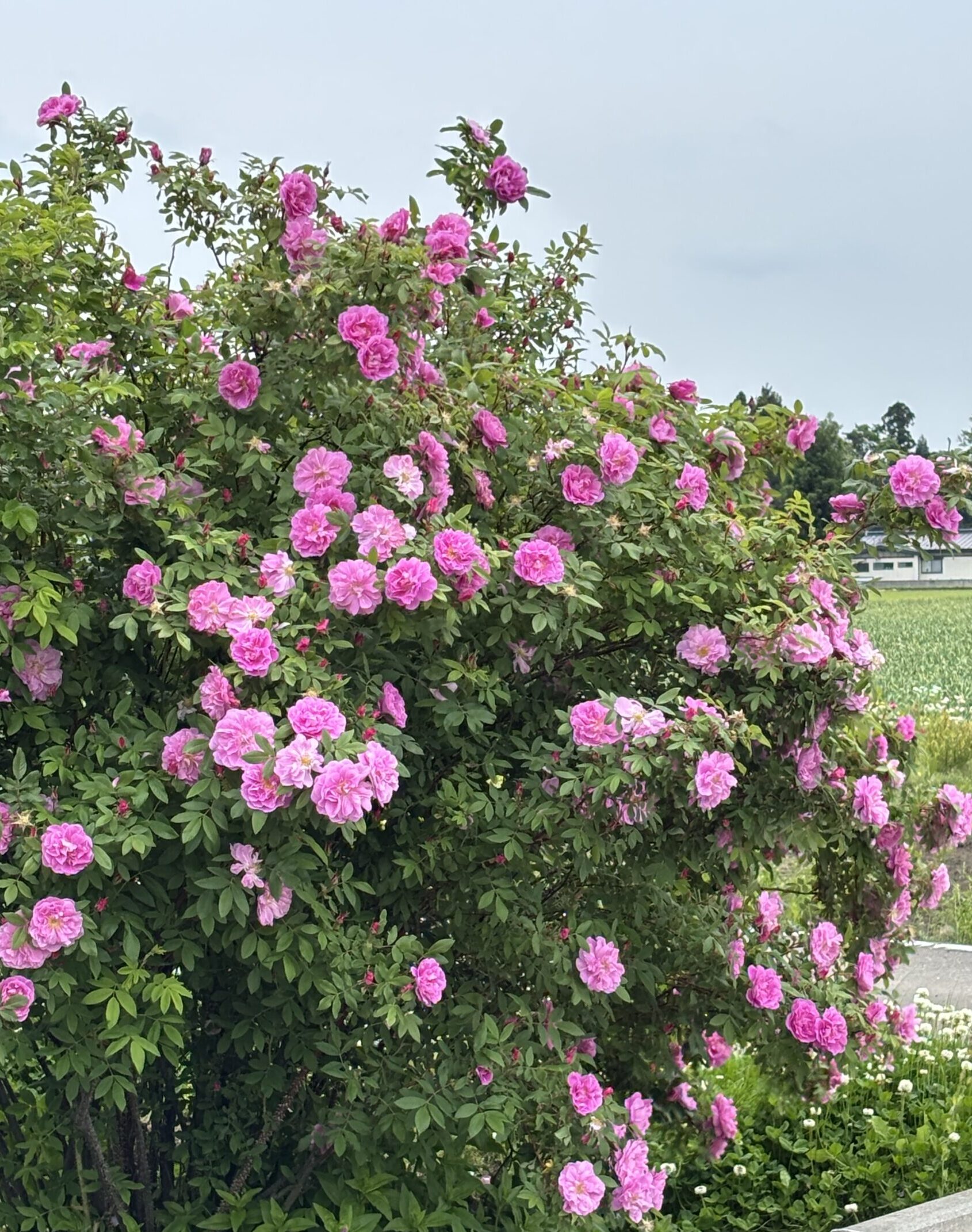 庭のハイシーズン到来を告げるバラ。高い耐寒性や花期花容など、ハマナスとの共通点は多いですが、立性の枝振りは棘が少なくスラリとしていて扱いやすく、花の無い時期でも優しげで上品な樹姿です。殆ど無剪定でもOK。腰高になり過ぎたら古幹を大きく切り戻して仕立て直し。あとは、ほぼほぼ放任してても自力で自然にそれなりな姿でいてくれるお利口さん。但し開花時には全体的に開帳しますので、樹高は180㎝以下に収めておいたほうが美しいです。強健で扱いやすく信頼してるので、庭に3株程点在しています。