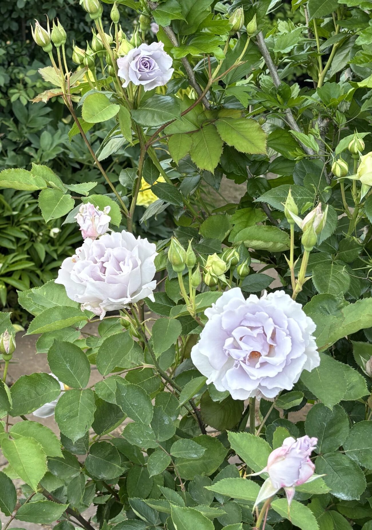フロリバンダとして扱ってはいますが、これが標準的なブッシュ樹形、花束状態に仕立てられるか?っていうと・・・・ん~~~・・・なんていうかな、もっと自由な感じです。枝数が少ない上に葉も茂らないので、樹姿はその時々の御本人次第としかいいようがない。なので剪定は臨機応変。他品種のバラは勿論、草花との混植でもかなり気を使ったほうがいいでしょうね。たまに強く高さの出る枝を伸ばしてることもありますがそれはコンスタントにはいかないみたいなので、庭植えするなら初めから低性品種あるいはパティオローズとして配置したほうが無難です。ホントは鉢栽培に向く品種だと感じてます。