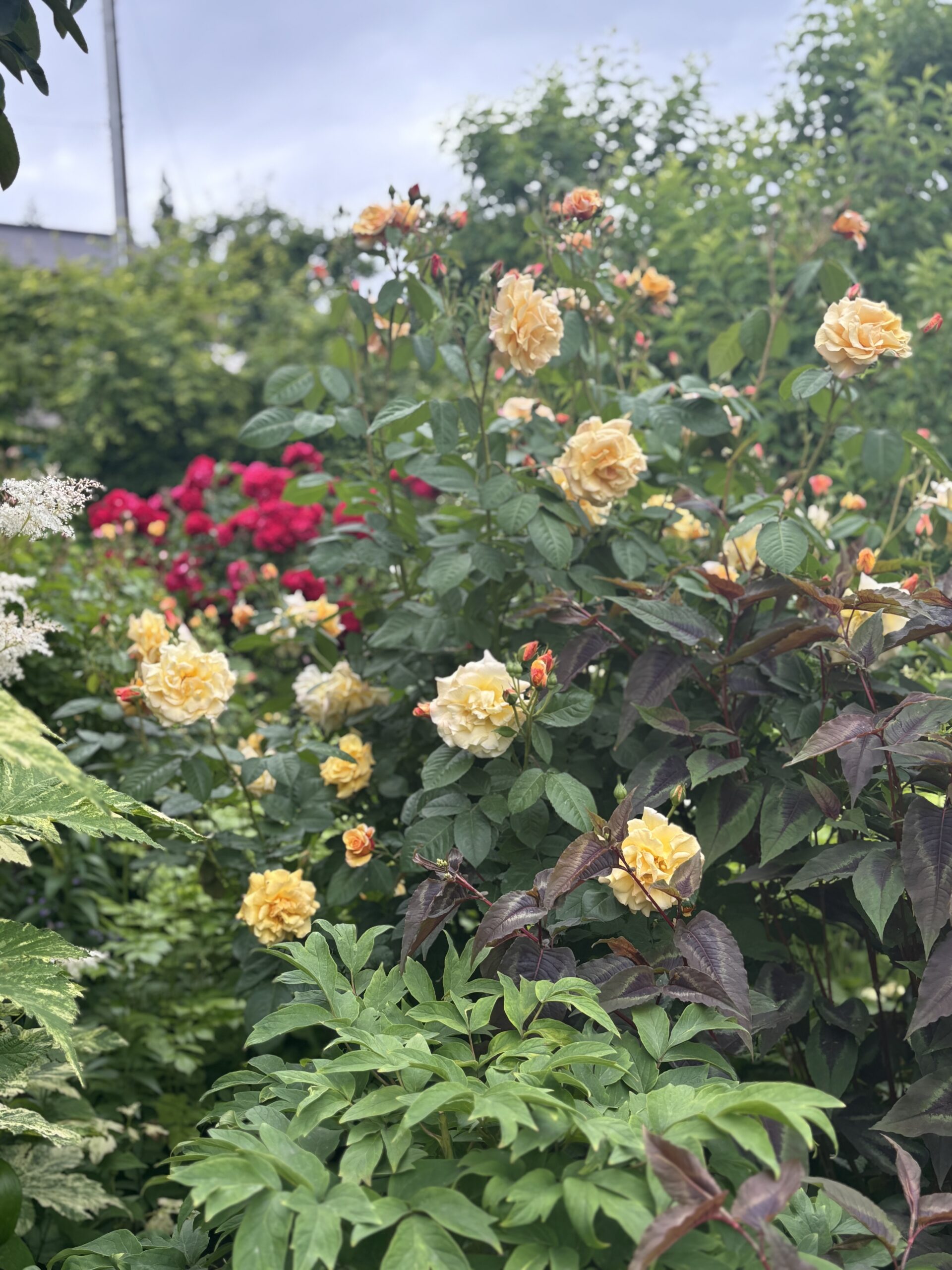 いっぽう⇧⇩後ろのドームに咲いてるバラ達は当庭の後半組。花期が長いとコラボの幅も広がります。