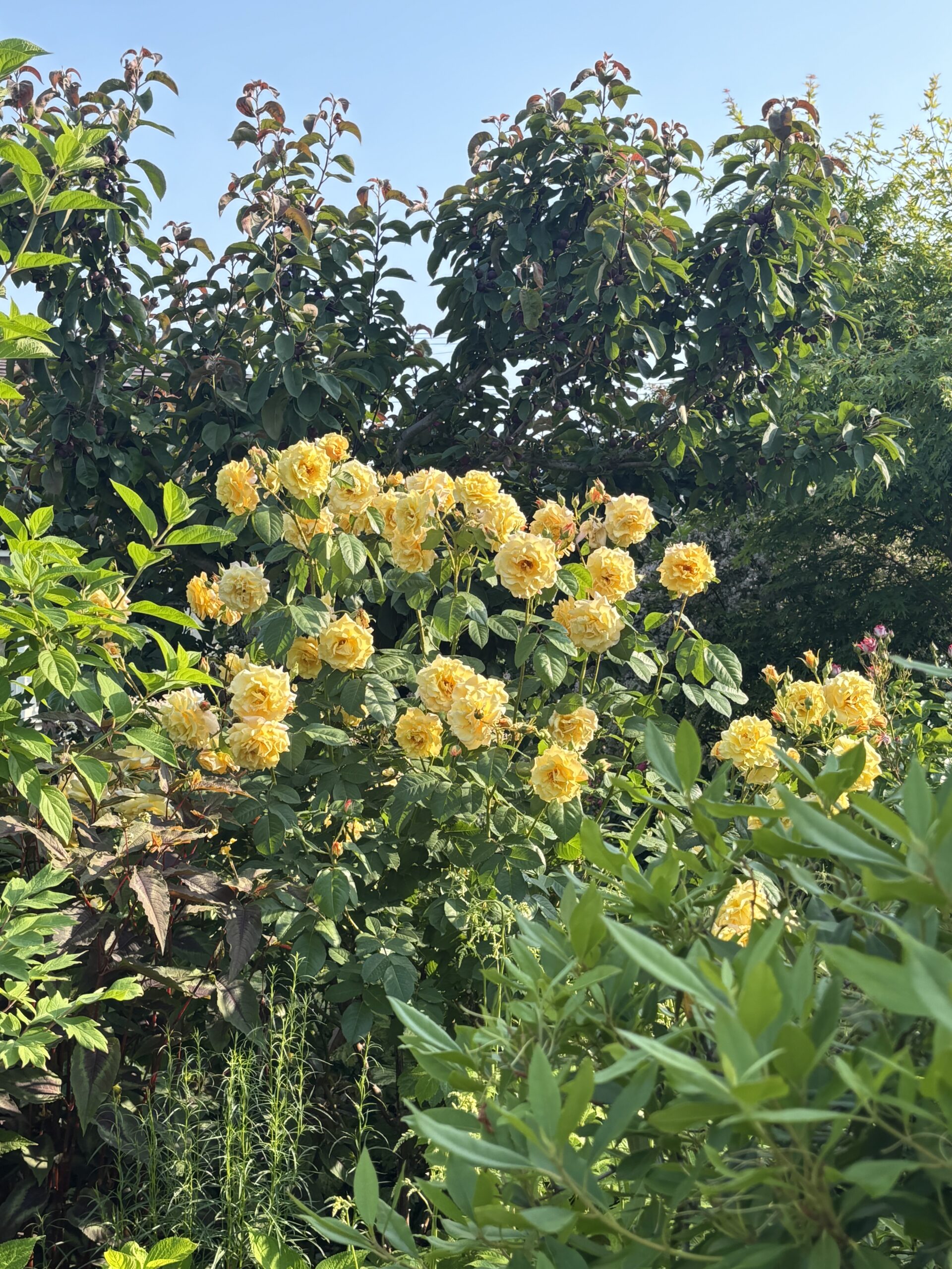 今んとこ、樹高は一番高いところで160㎝くらいかな。ご覧の通りかなり伸長力があるんで、枝ぶり自体は半直立性ですけど花期はちと開帳気味になります。しかもこの方、成木になるとベーサルシュートが出にくくなるタイプかもしんない。なので油断してるとかなり腰高になりそう。自立させて自然樹形を楽しむなら冬季剪定はガッツリ容赦なくいっちゃったほうが良さげ。もしくは何年かに一度は適宜仕立て直し(主幹の切り戻し)をするか。