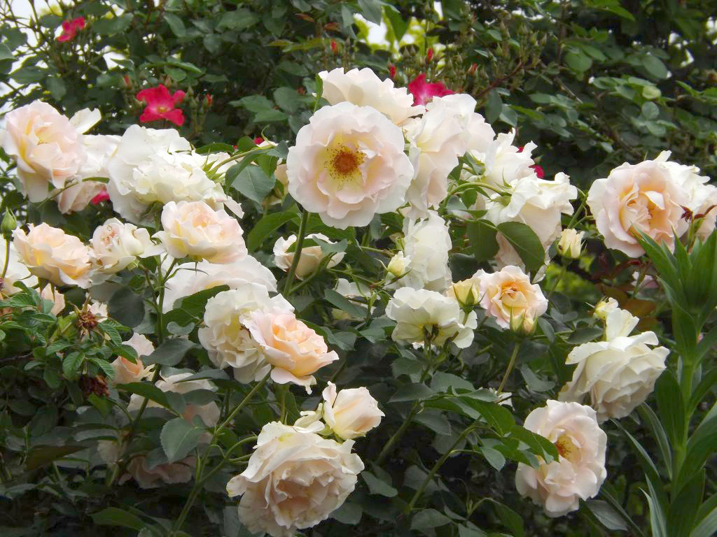 おしゃれ感に溢れたタンタウらしい品種。暖地ではつる扱いだそうですが、枝振りのまとまりもいいのでうちでは大型ブッシュとして自然樹形に。(シュラブに分類してもいい位ですが、とりあえず当庭ではブッシュ仕立てにしてるので)こういうタイプのコが広い庭では一番助かる。