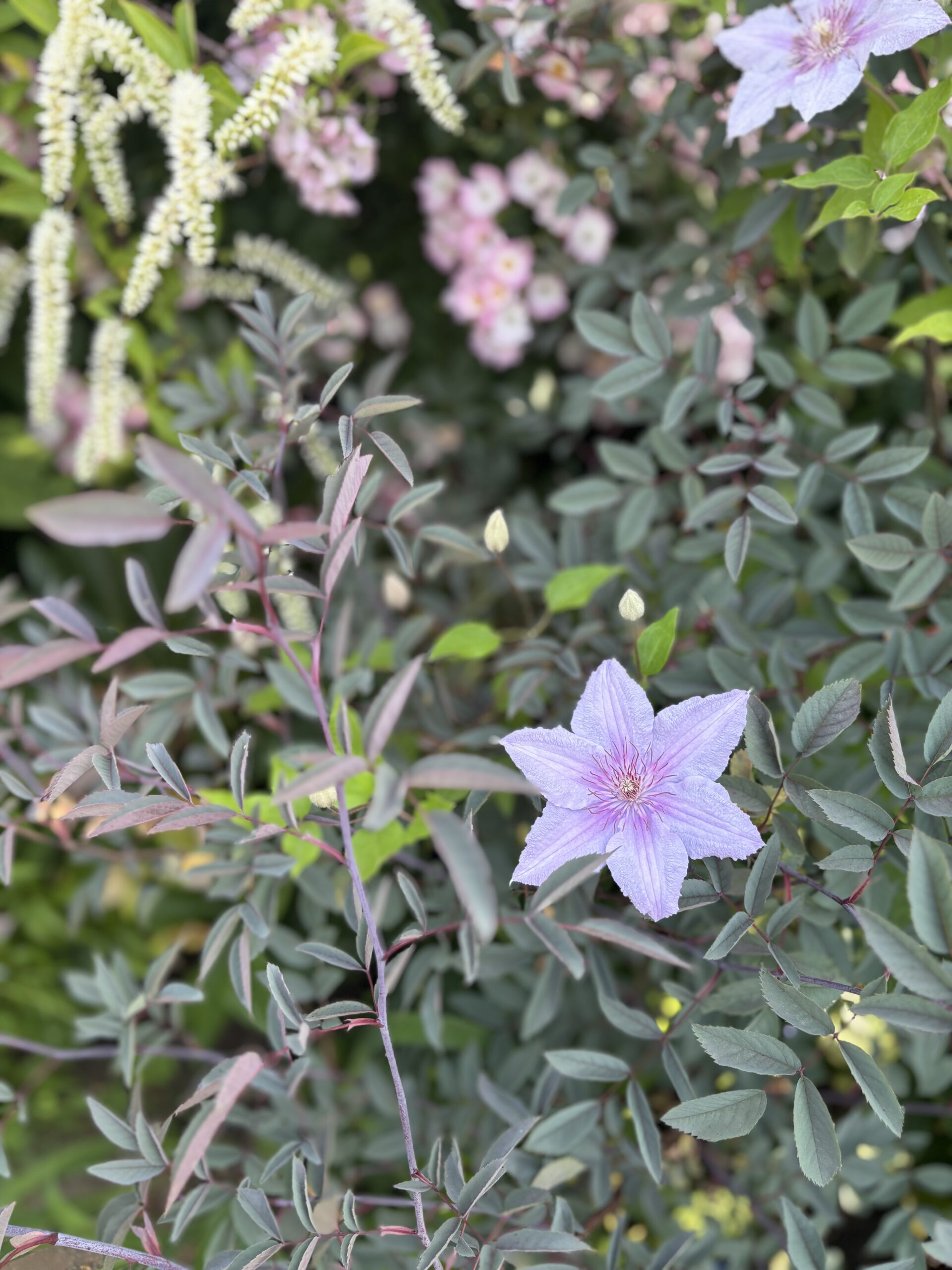 春から花期の終わりまでの葉色はご覧の通りの赤紫⇩がかった銅葉ですが、夏は青みが増してちょっとブルーベリー色っぽく感じられます。それもまた夏らしくて良きw ⇧クレマは確かマルモリ