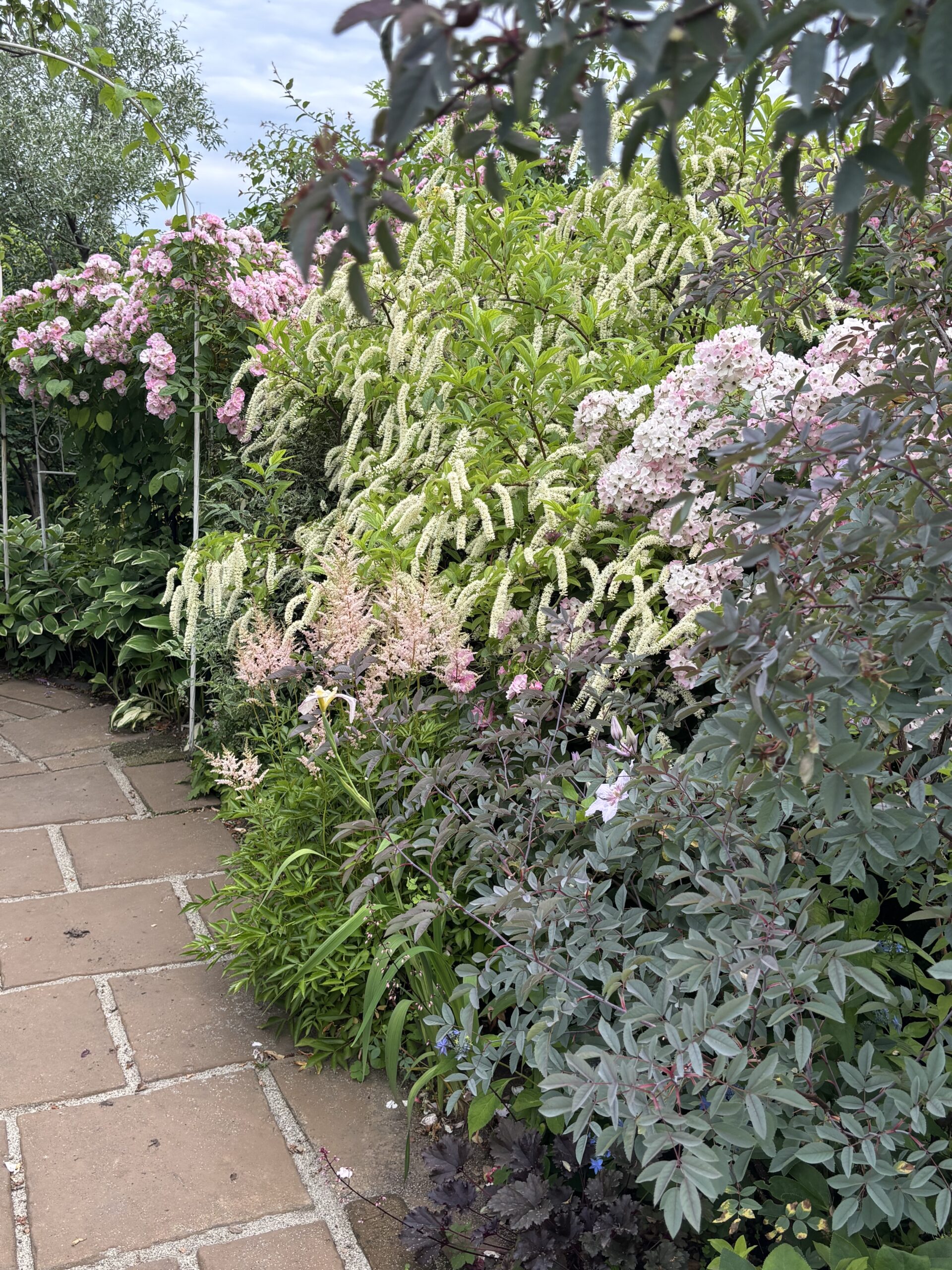 ⇧⇩はクレマのロウグチとミケリテ。故意には誘引してませんが、グラウカのシュラブに挟まってるor勝手に絡まってる状態。『ラクして見栄えよく』が庭主のモットーww