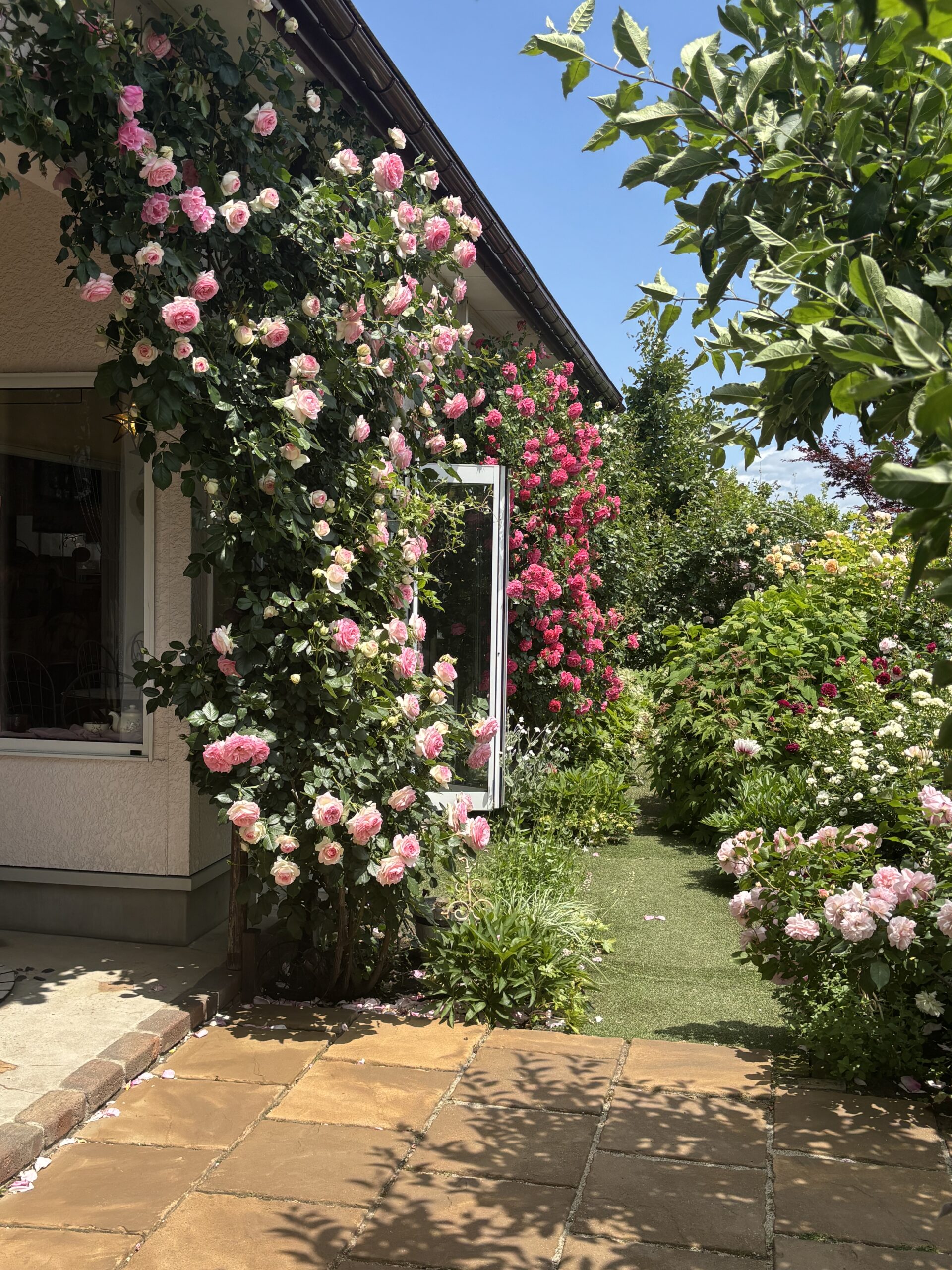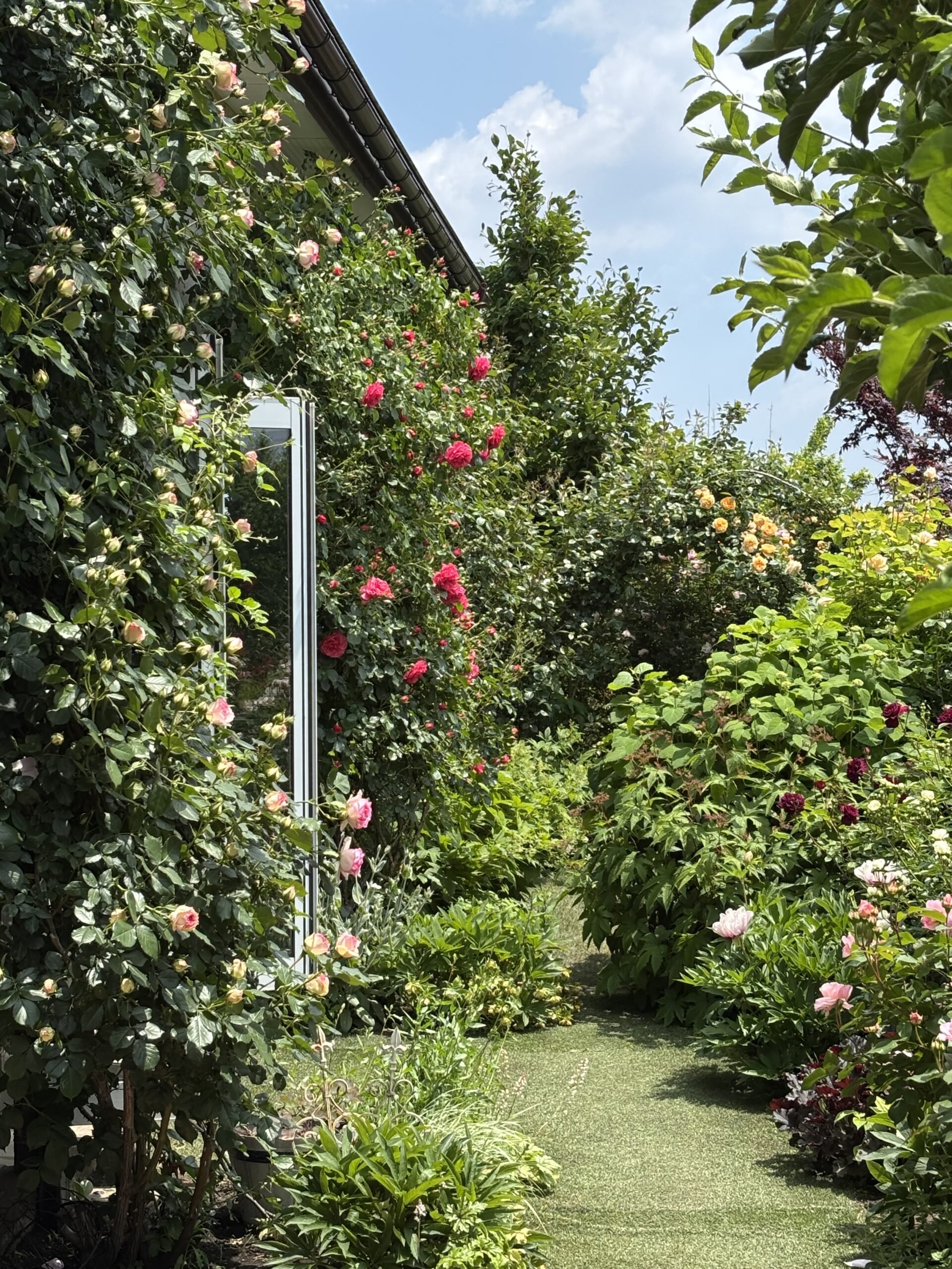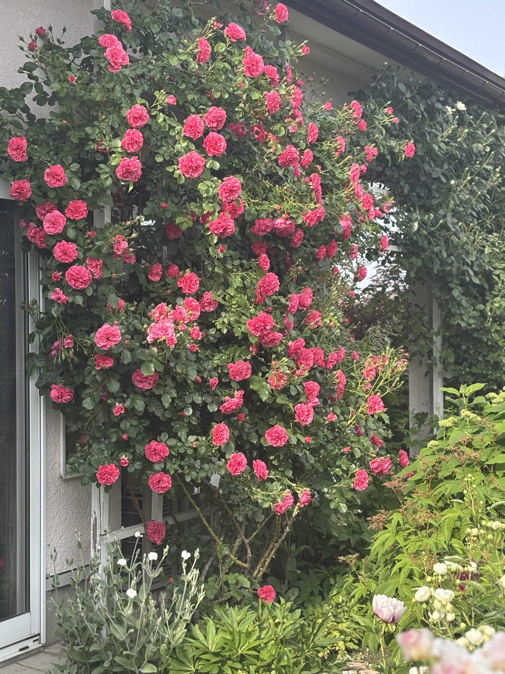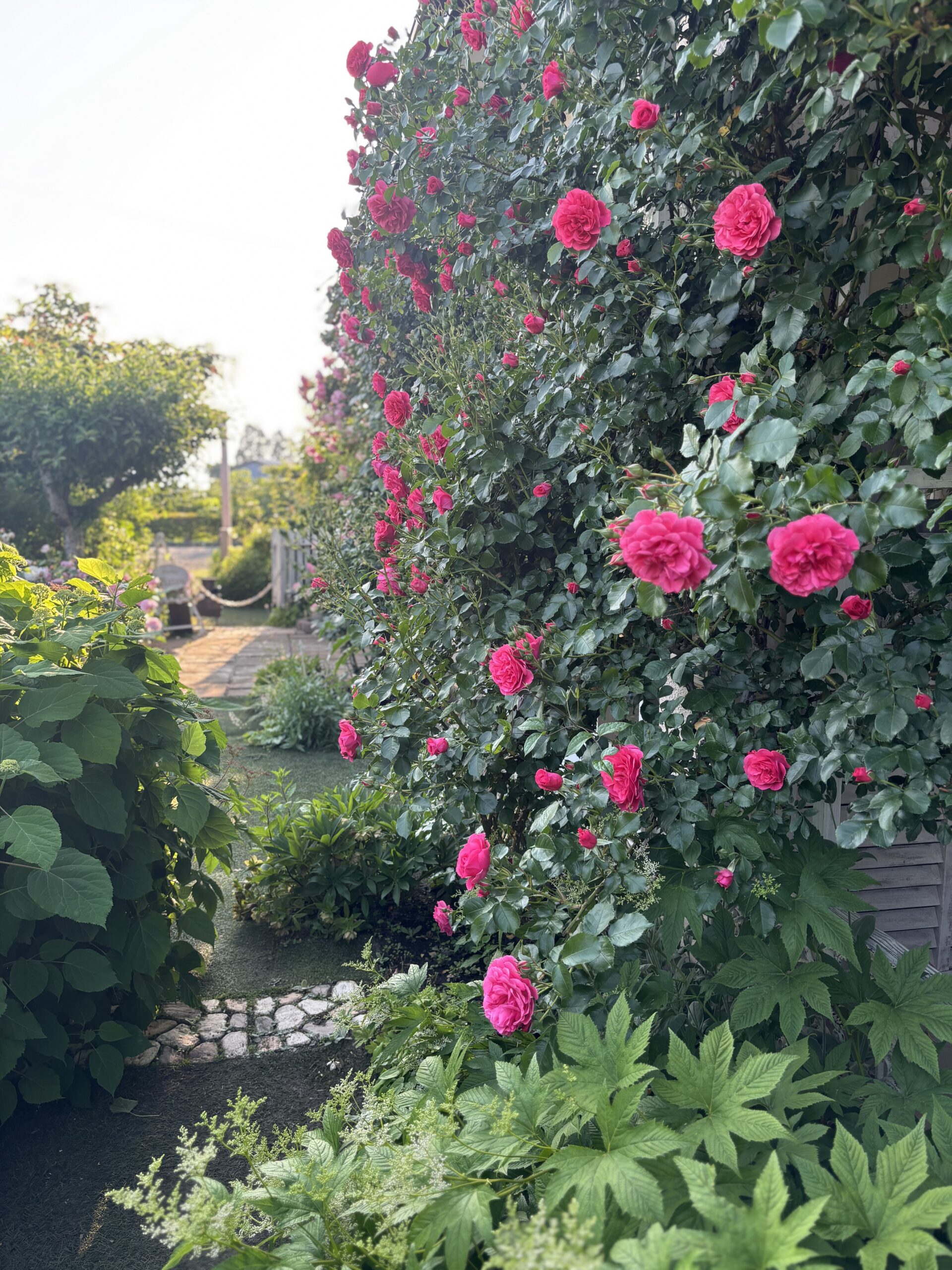で、⇧⇩こちら側のお隣は遅咲きのモン ジャルダン エ マ メゾン パッとみ三傑競演!にも見えますが、よくみると中咲ロン様が終わりかけ。巷ではよく『バラ同士或いはバラと草花を組み合わせて、その花期を揃えて魅せる手法』をコラボって言いますよね。もちろん私自身もちょいちょい使いますが、でも庭景色って、音楽や物語と同じだと思うところもあって。なんていうか・・・・一瞬の煌めきを切り取っただけでは美しい旋律や物語にはなり得ないでしょう? とめどない時間の流れとか折り重なって響きあう・・・・・って、あり?何の話してたっけ?(⇦通常運転ww)