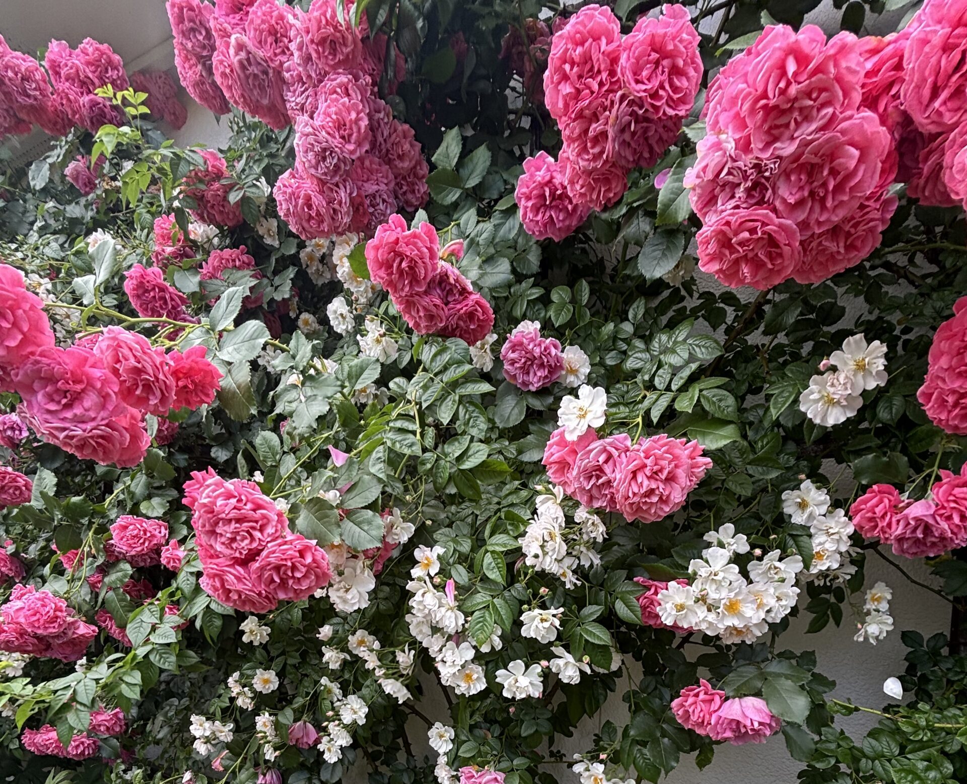 そしてかなり咲き極まった状態が⇧⇩ 真ん中から下のほうが特にそうかな。でも汚くはないからすごく助かる。先に咲き終わった花がブルーイングした状態で花房の中にステイしてる感じ。基本的には先に咲き終わったものは一つずつ手で摘みとるのが確実なんだけど、何しろその時期は最盛期ど真ん中なので庭主一同手一杯! なので⇧の状態になってもなお間に合わなければ庭ボウキを持ってバッサバッサと叩きます。すると咲き終わってもなお花房の中にシレッとステイしてた花だけが見事に散り落ちてとりあえずキレイになる。その作業中、運よく(?)遭遇したお客様はほぼ120%悲鳴を上げます(笑)。桜吹雪ならぬ薔薇色の猛吹雪! 咲いて絵になるドコロか、このバラはもはや散り際までがパフォーマンスなのかも。ちなみにこの薔薇吹雪になる品種は他にもいくつかあります。なのでアトリエの庭ボウキはこの時期、大活躍です(笑)。あ、もちろん花房が全部咲き終わったら切り戻しますけどねww