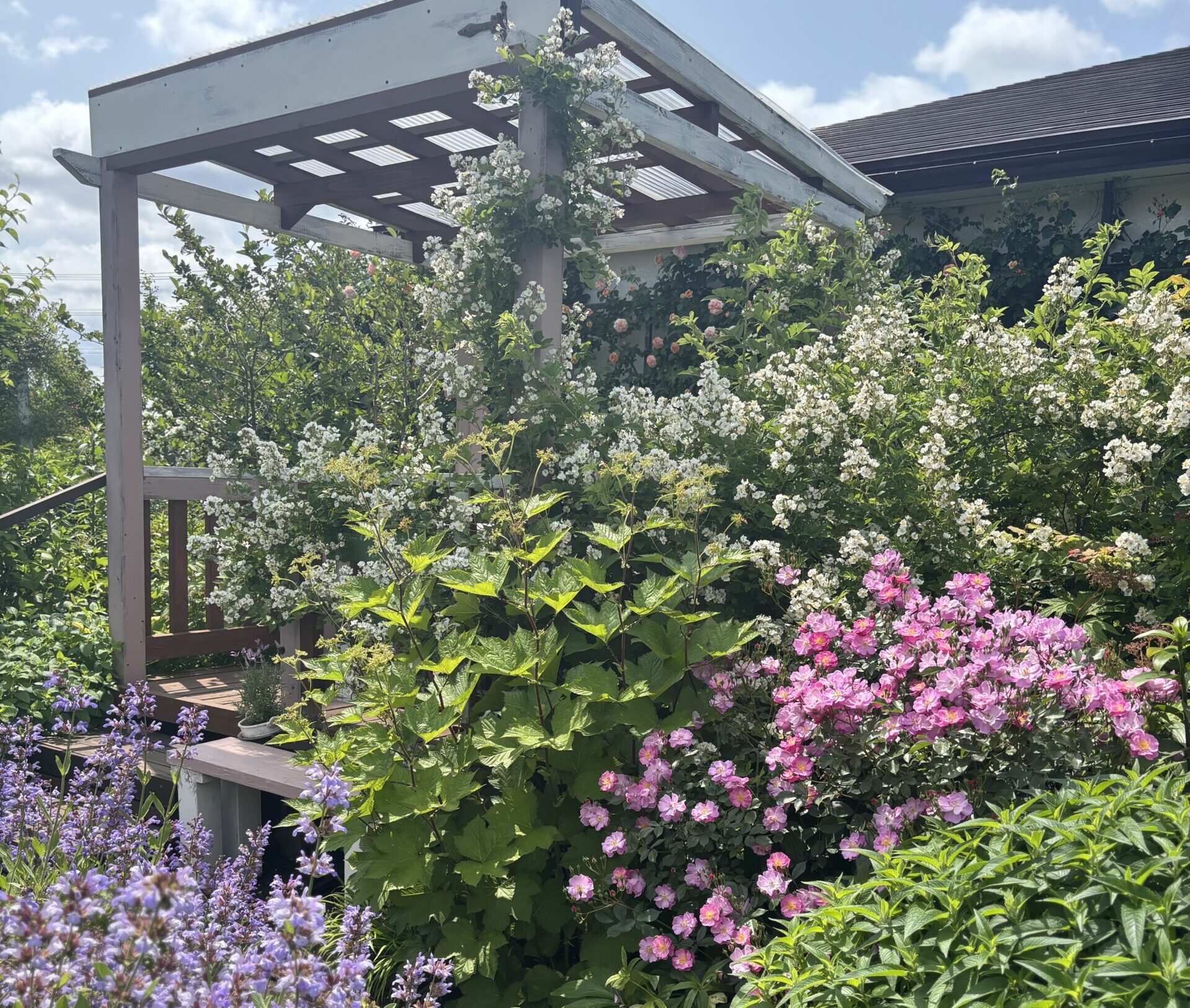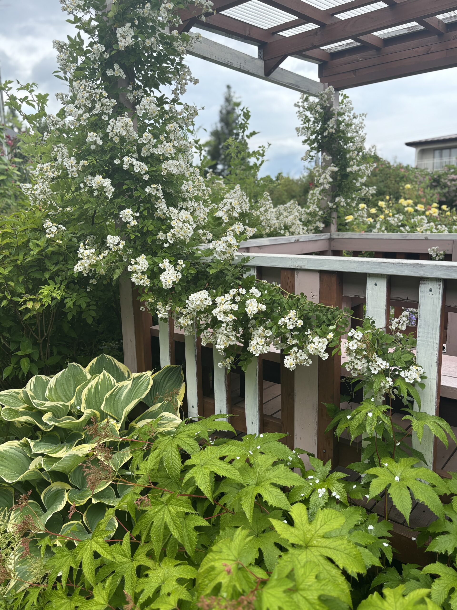 庭という空間で、植栽植物はお互いに響きあって景色を作り上げていく。単植栽培では決して感じ得ない美しい旋律。野ばら 原種 ノイバラ ムルティフローラ Rosa multiflora サラ バン フリート サラ ヴァン フリート Sarah van Fleet