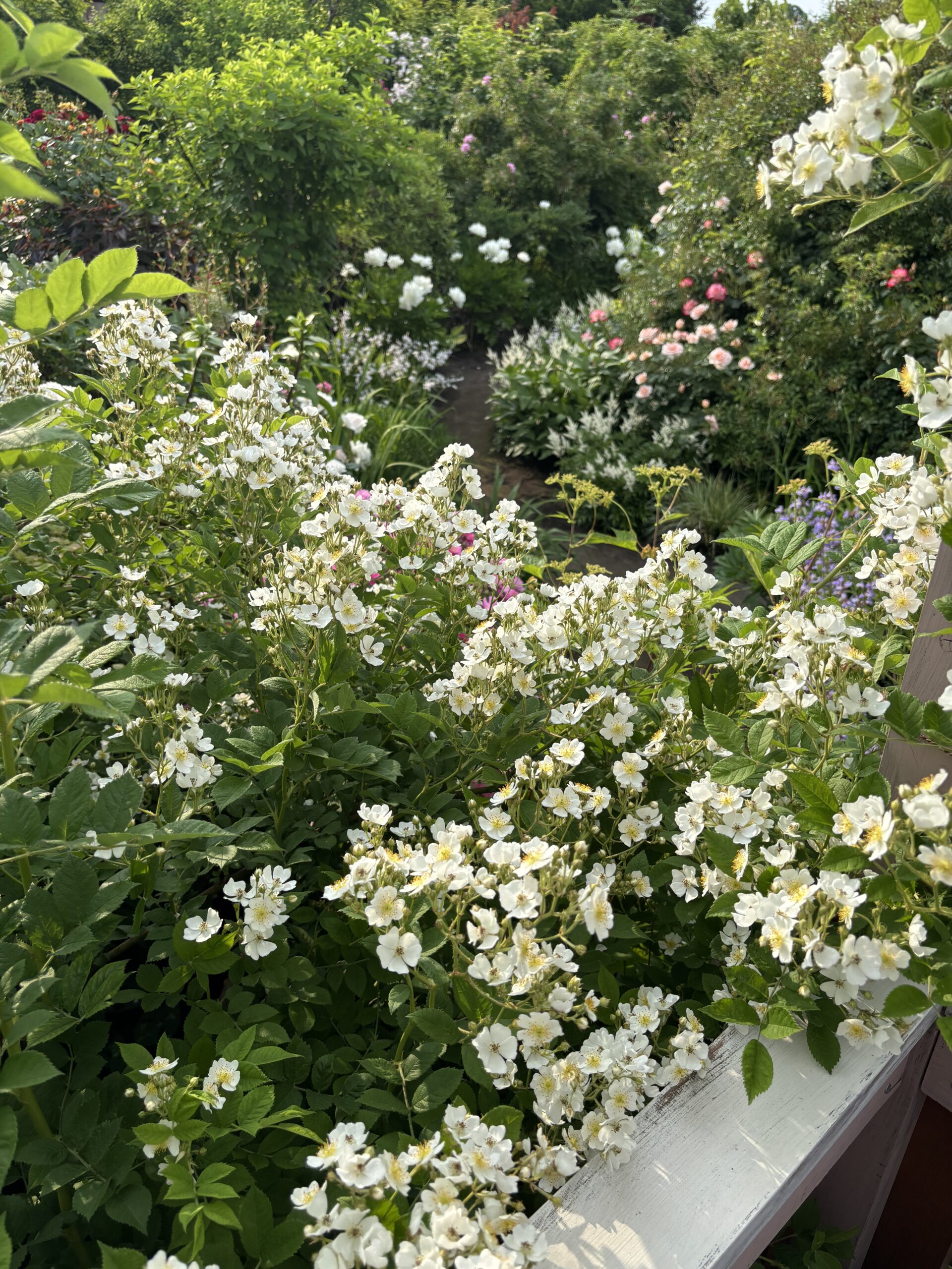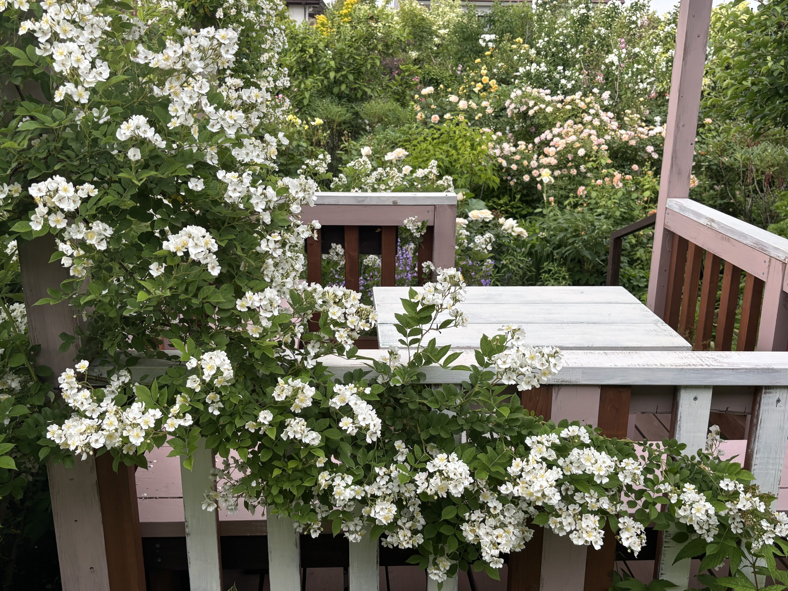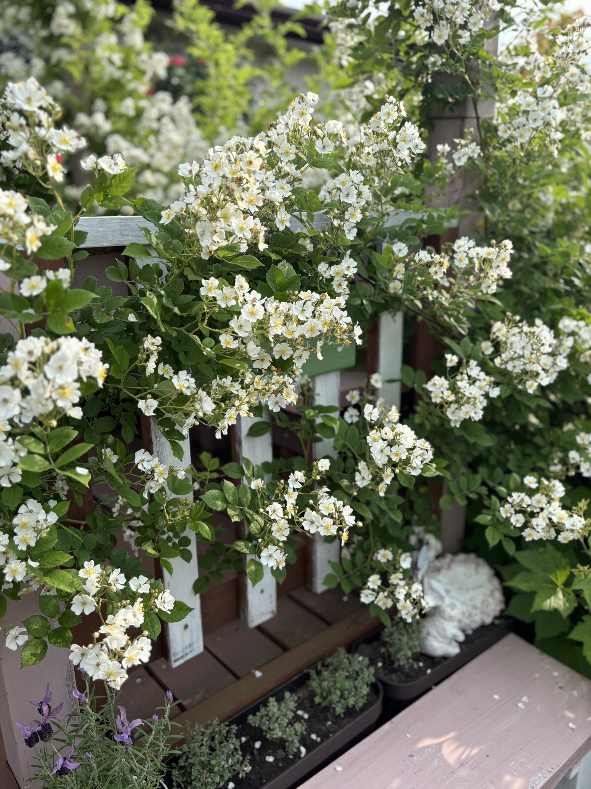 自然樹形そのものが大変美しいシュラブを形成し、花はどんなガーデンローズあるいは花木と隣合わせても相性よく収まります。そういう意味ではバレリーナが近いけれど(ってかそもそもバレリーナはノイバラの血が色濃い品種だし)バレリーナよりかなり大型で、白花の分だけ雰囲気は甘さ控えめ。なので他の原種&オールドローズと組み合わせてもいいし、イングリッシュローズと組み合わせてロマンチックな風景を作ることも出来るし、逆にソリッドでシックな庭にも嵌まると思う。もちろん和風なら言うまでもありません。これぞオールマイティ。一季咲きですが秋には無数のヒップも実るし(漢方薬らしいですね)何しろ強健だし、どんな園芸種と並べても一切遜色しない。しかも専門店での取り扱いは棘無しの選抜種とくれば非の打ち所がないでしょう(笑)。一斉開花するので満開時の光景は本当に見事です。周辺一帯がふんわりと香ります。