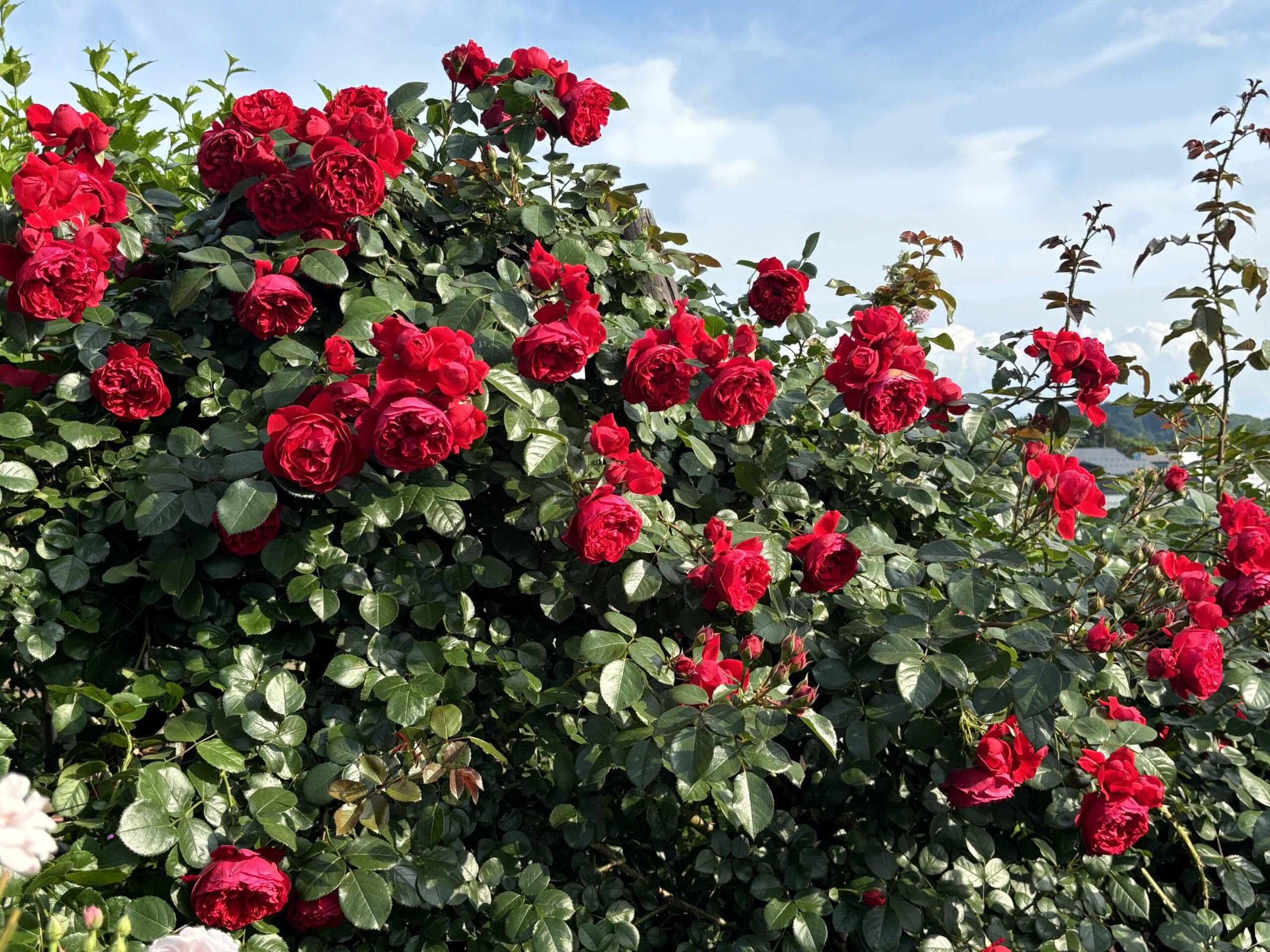 ⇧⇩チラチラ見えてるパイプアーチに誘引しています。植栽位置が庭のコーナーに当たる場所なんで素直にフェンス設置するって手もありましたが、そうすると平面すぎて面白みにかけるだろうし、なによりこの重量感でもって強風に煽られる場合のことを考えたらかなり恐ろしくって。