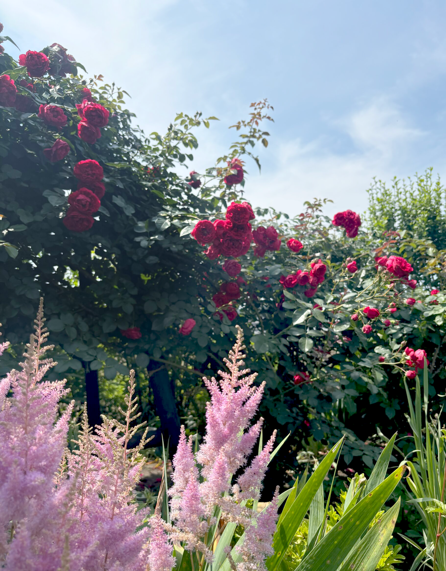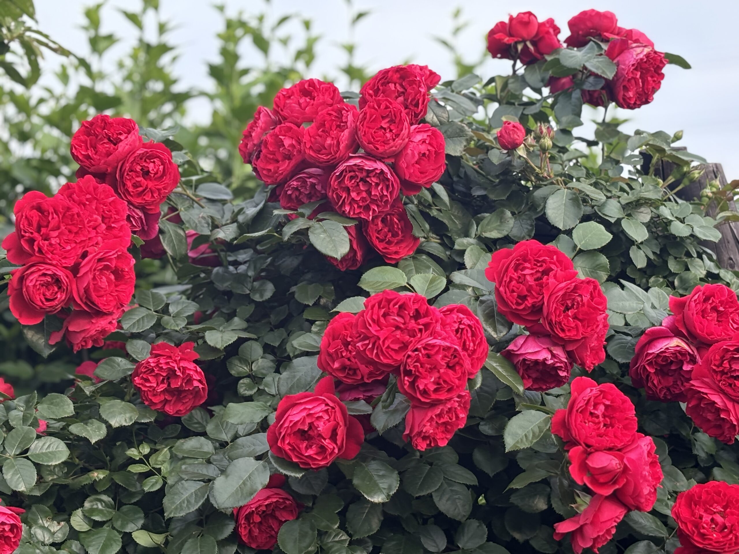 その上で書き添えますと、このフロレンティーナはおそらくルージュピエールドロンサールよりも、よりロンサールに似た開花風景を魅せてくれる紅ツルバラなのではないかと。もちろんロンサールとはそもそもの樹形や樹姿は違いますけれども、先述した通り非常にしなやかなツル枝なので如何様にも誘引出来るでしょうし(とはいえ太枝です。ダイナミックにいきましょう!)花の風情は優雅に首を傾げる大輪アンティーク風ですし。とはいえコラボ出来るかと言えば残念ながらNO。ルージュ同様こちらも遅咲きなので。逆にいえば、ロンサールの花後の喪失感を劇的に払拭させる力があります。チカラが・・・・そう、力・・・・うん。但し、です。但し、うちでこんだけ強健に力強く伸びてる品種が、暖地栽培でどうなるかまではちょっと与り知らないトコロですけどね(笑)。