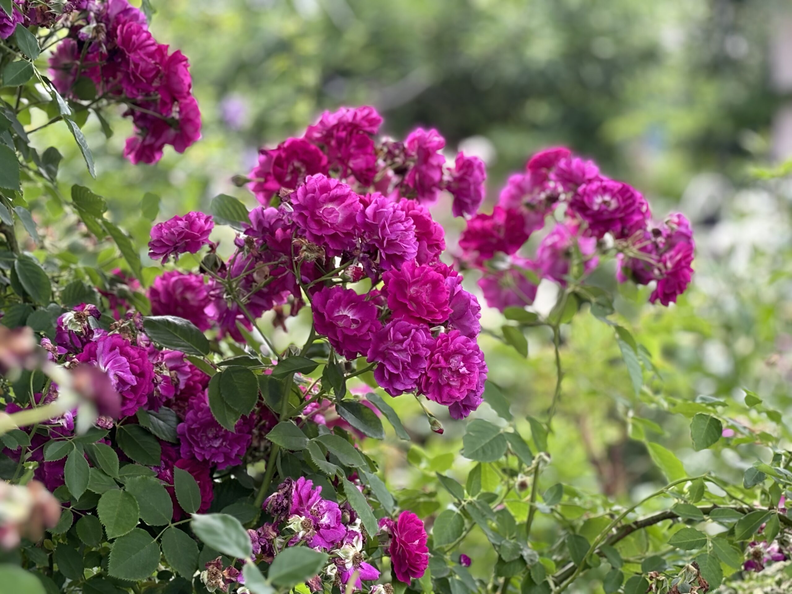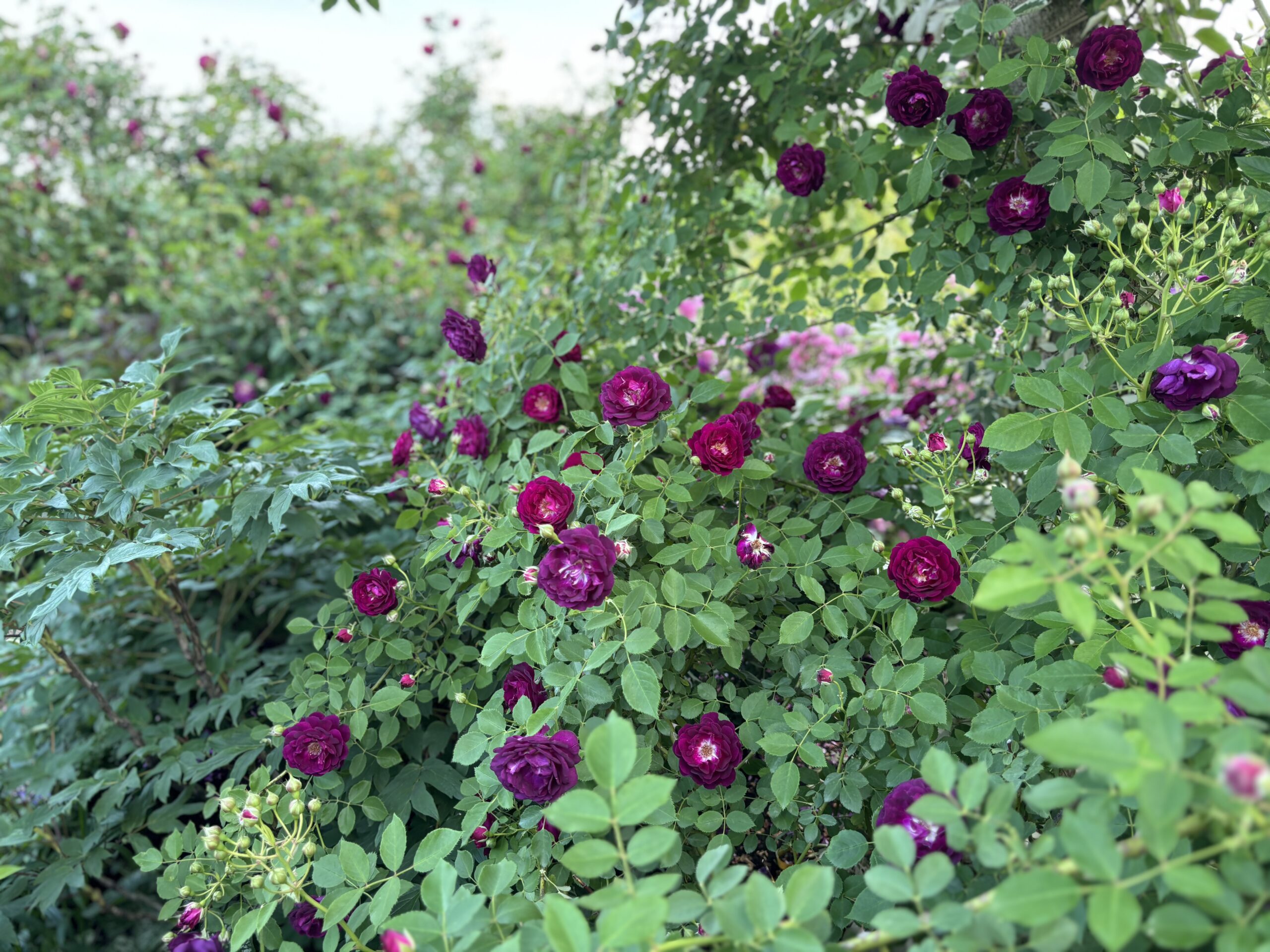 「遅咲きで、赤紫もしくは濃いローズピンクの小輪。出来れば細枝のよく伸びるシュラブもしくはツル。但し周辺植栽の事情を考えると匍匐性はNG。そこそこ自立出来るタイプがベスト。繰り返し咲き性はさほど求めない。でもランブラー系ほど大型化するのは出来ればちょっと・・・って、でも一番譲れないのは遅咲きよ?遅咲きであること以外のスペックは場合によっては考え直してあげても構わないわ。。。」という、非常に間口の狭いんだが緩いんだかよく解らない我儘な希望によって探し回っていたバラ。とはいえ中々見つけられず、何とかアタリをつけてお迎えしたパルフェタムールが中咲だった時には「・・・だったらもうキングでいんじゃね?」ってなってたんですが。漸く見つけました☆彡 ほらね!バラはやっぱり『求めよさらば与えられん』なのよ! もちろん小さな苗を植えつけて望み通りの景色を作れるまでには数年以上かかるでしょう。でもだからこそバラに限らず苗はとっとと植えるのよ(笑)! じゃないといつまで経っても理想は現実になってくれないんだから。