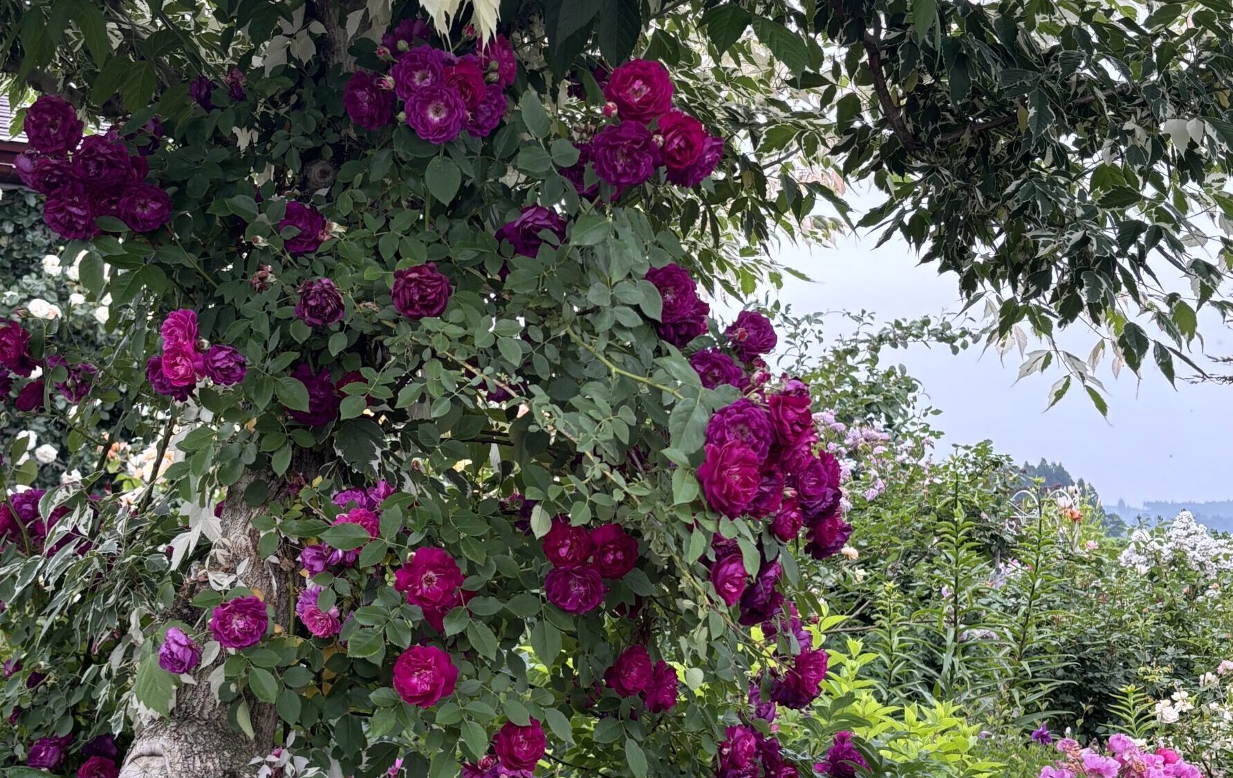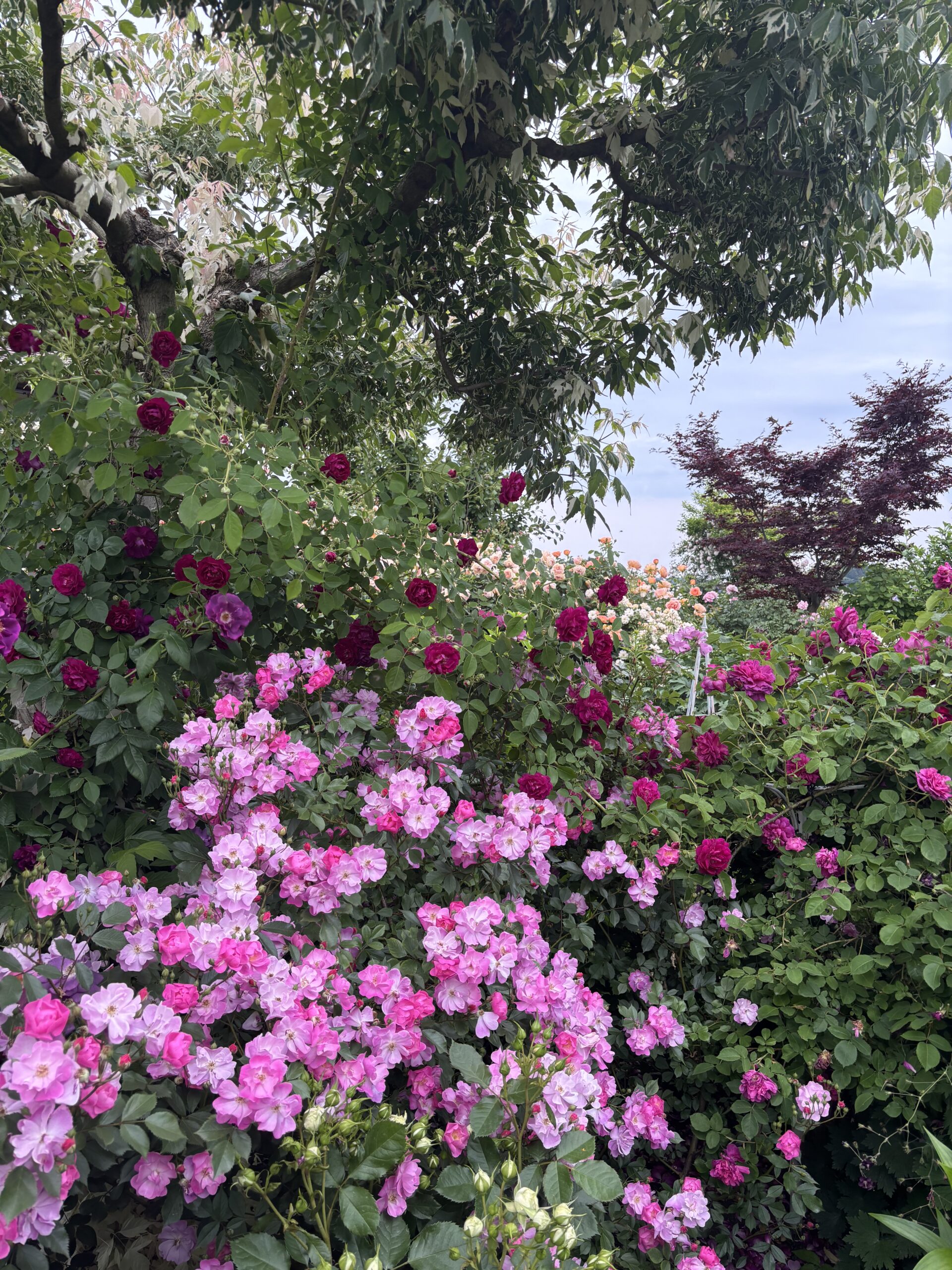 もともとアイヴァンホーをここにお迎えしたのはこのエリアに遅咲きの主役バラが欲しかったため。とはいえスペース的に大型シュラブはムリだから、エリア中心部にいるネグントカエデにひっかけることで空間を共有させようとして選んだツルバラ。