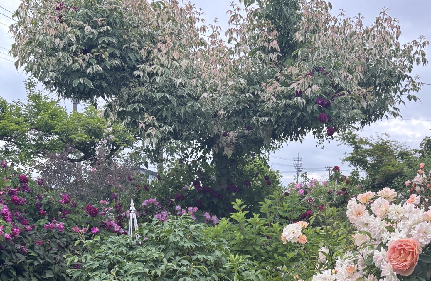 もともとこの木は本来高木であり、この庭仕様で管理し続けるには年に2,3度は大きく刈り込まなくちゃいけない程に樹勢が強い。冬季ならまだしも夏季の剪定は脚立かける足場も作りづらく(バラを含めた植栽植物がエリア内ギュウギュウワッサワサに茂ってるため)剪定するのに非常に難儀していました。とはいえ剪定しないと樹冠下周辺が思いっきりの日陰に入ってしまって植栽植物たちの生育に差し障るので毎度毎度の四苦八苦。