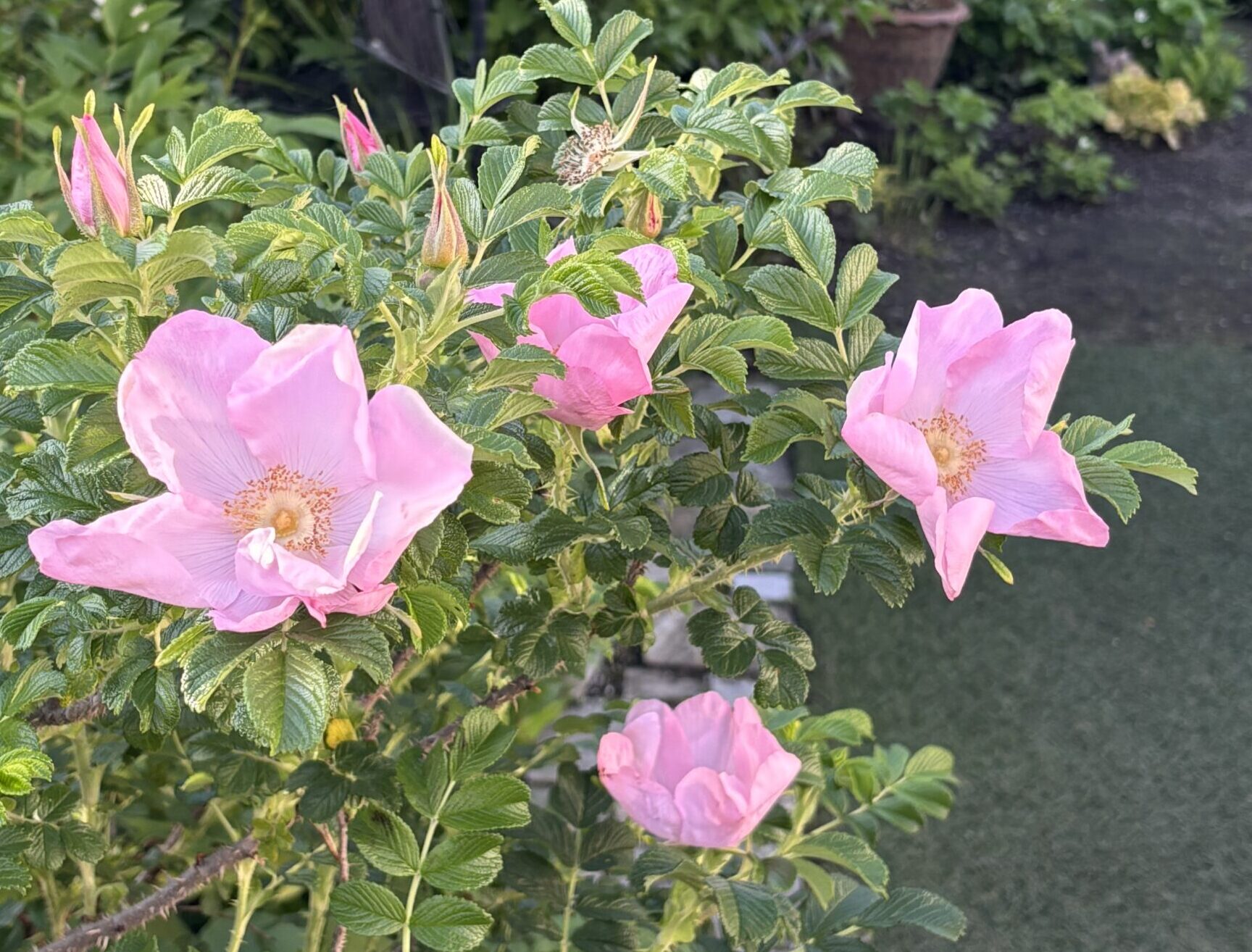 だって耐病性&耐陰性&耐寒性に優れた強健種で、しかもコンパクトだから鉢でも露地でもどこでも栽培可能。放任でもOK。花はハマナス特有の透明感がある淡いピンクで、蕊の美しいシンプルな平咲。繰り返し咲く。香りもいい。赤い実もなる。もちろん棘は多いけど、私はそれも含めて子供に与えるファーストローズとしては(母の日プレゼントだけど)最高オブ最高!なチョイスだと大変感嘆しております。