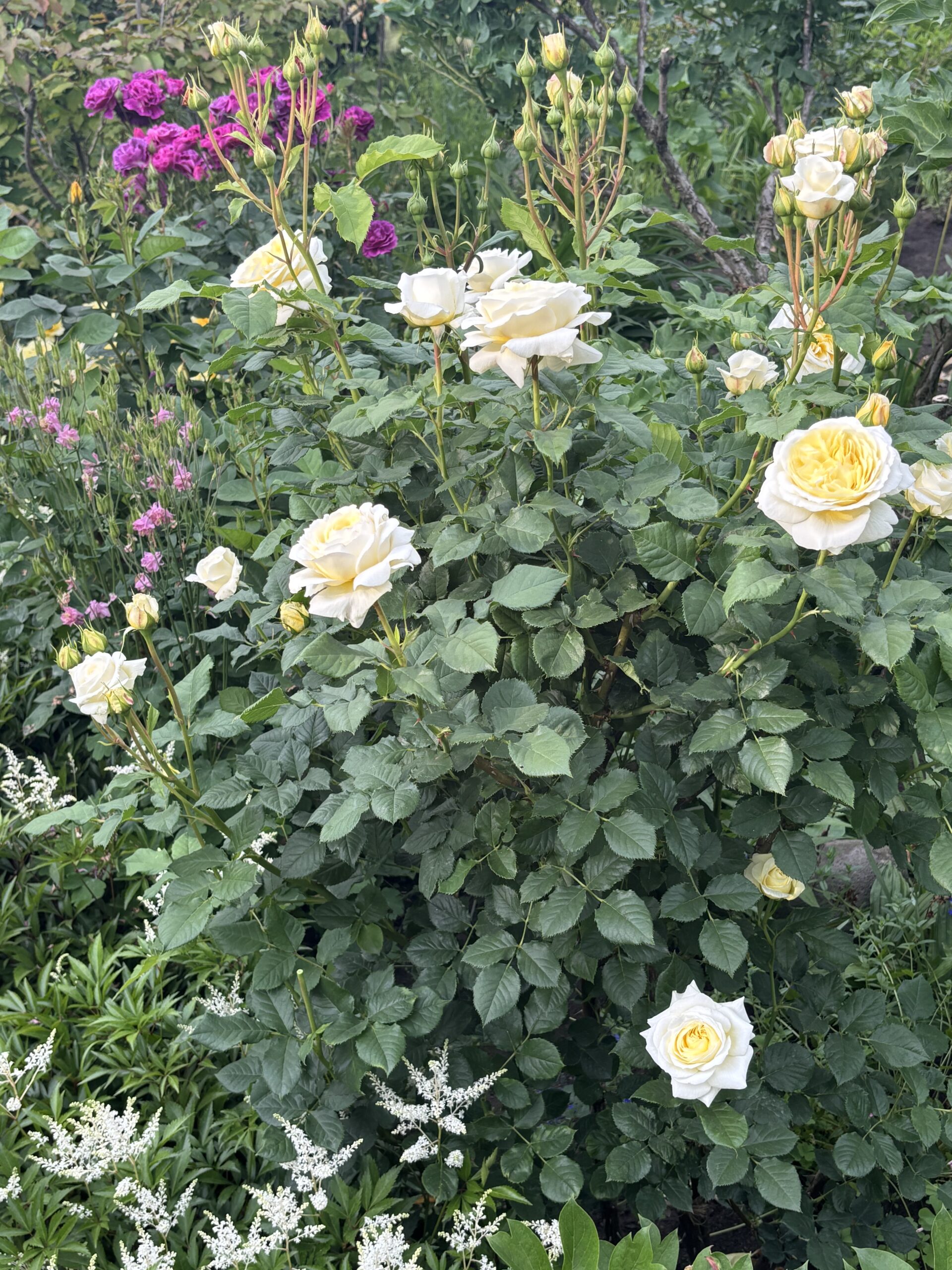 実際に庭で咲いた時の印象はERっぽくは無かったです。確かにこうして画像で見る限り、ごく淡いパステルイエローの上品なグラデーションとか、カップ&ロゼッタの今様アンティーク風な感じとかはそれっぽいんですけれども、何しろ樹形が紛うこと斯きフロリバンダブッシュ⇧ なので、庭で咲いてる風情はどこからどうみても典型的なモダンローズです。